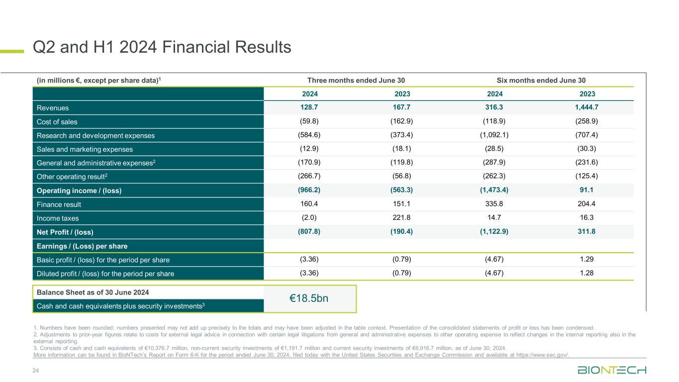 2024年Q2和H1财务业绩24(百万欧元,每股数据除外)1截至6月30日止三个月2024202320242023收入128.71 67.73 16.31,444.7销售成本(59.8)(162.9)(118.9)(258.9)研发费用(584.6)(373.4)(1,092.1)(707.4)销售及营销费用(12.9)(18.1)(28.5)(30.3)一般及管理费用2(170.9)(119.8)(287.9)(231.6)其他经营成果2(266.7)(56.8)(262.3)(125.4)营业收入/(亏损)(966.2)(563.3)(1,473.4)91.1财务成果160.41 51.13 35.8 204.4所得税(2.0)221.81 4.7 16.3净利润/(亏损)(807.8)(190.4)(1,122.9)311.8每股收益/(亏损)本期每股基本盈利/(亏损)(3.36)(0.79)(4.67)1.29期内每股摊薄利润/(亏损)(3.36)(0.79)(4.67)1.28 1。数字已四舍五入;所提供的数字可能与总数不完全相加,可能已在表格上下文中进行了调整。综合损益表的呈列方式已简明。2.对上一年数字的调整涉及与某些法律诉讼相关的外部法律咨询费用,从一般和行政费用调整为其他运营费用,以反映内部报告的变化,也反映在外部报告中。3.包括截至2024年6月30日的现金和现金等价物103.767亿欧元、非流动证券投资11.917亿欧元和流动证券投资69.167亿欧元。更多信息,请参见BioNTech今天向美国证券交易委员会提交的截至2024年6月30日止的6-K表格报告,该报告可在https://www.sec.gov/上查阅。截至2024年6月30日的资产负债表185亿欧元现金和现金等价物加上证券投资3
