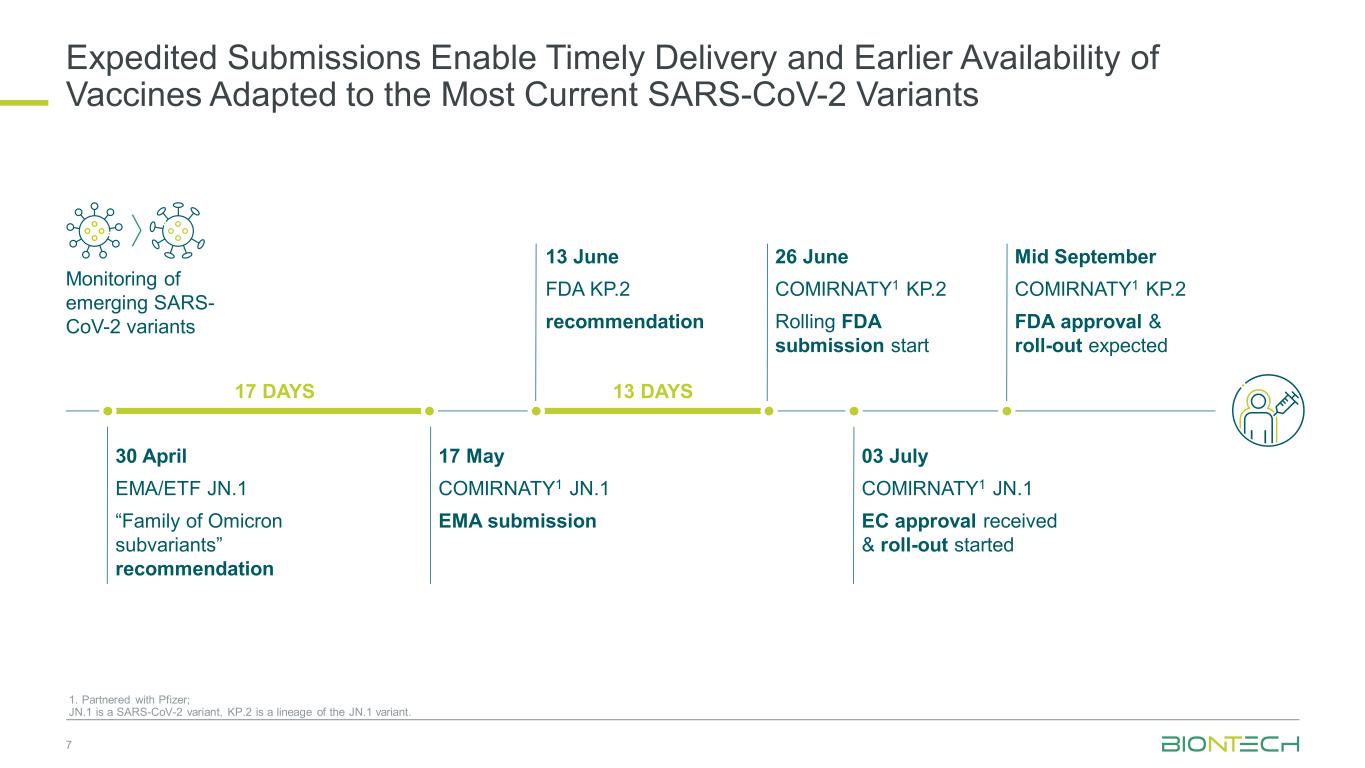 加速提交可使适应最新SARS-CoV-2变异株71的疫苗能够及时交付和更早上市。与辉瑞合作;JN.1是SARS-CoV-2变异株,KP.2是JN.1变异株的谱系。8/5/20246月13日FDA KP.2建议7月3日COMIRNATY1 JN.1 EC批准获得并开始推出4月30日EMA/ETF JN.1“Omicron亚变体家族”建议6月26日COMIRNATY1 KP.2滚动FDA提交开始5月17日COMIRNATY1 JN.1 EMA提交9月中旬COMIRNATY1 KP.2 FDA批准和推出预计17天13天监测新出现的SARS-CoV-2变体