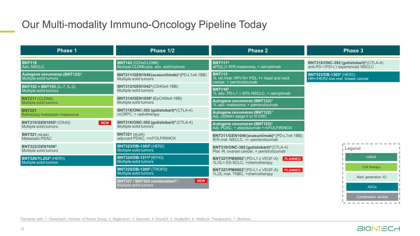 BNT327/PM80027(PD-L1 x VEGF-A)1L/2L符合。TNBC,+化疗计划了我们今天的多模式免疫肿瘤学管道10与:1。Genentech,罗氏集团成员;2。再生元制药;3。Genmab;4。OncoC4;5。DualityBio;6。MediLink Therapeutics;7。Biotheus。1期1/2期2期3期BNT211(CLDN6)多个实体瘤BNT312/GEN10423(CD40x4-1BB)多个实体瘤BNT316/ONC-392(Gotistobart)4(CTLA-4)多个实体瘤BNT142(CD3xCLDN6)多个CLDN6-pos.adv.实体瘤BNT325/DB-13055(TROP2)多个实体瘤BNT316/ONC-392(Gotistobart)4(CTLA-4)抗PD-1/PD-L1经历NSCLC BNT323/DB-13035(HER2)多个实体瘤BNT324/DB-13115(B7H3)多个实体瘤BNIL-2)多个实体瘤BNT221难治性转移性黑色素瘤BNT321(sLea)转移性PDAC BNT322/GEN10563多个实体瘤Autogene cevumeran(BNT122)1多个实体瘤BNT314/GEN10593(EPCAMX4-1BB)多个实体瘤mRNA下一代IO细胞疗法Legend组合研究ADCs BNT326/YL2026(HER3)多个实体瘤BNT1112 aPD(L)1-R/R黑色素瘤,+ cemiplimab BNT113 1L rel./met。HPV16 + PDL-1 +头颈癌,+ pembrolizumab Autogene cevumeran(BNT122)1 1L adv.melanoma,+ pembrolizumab Autogene cevumeran(BNT122)1 adj. ctDNA + II或III期CRC BNT1162 1L adv. PD-L1 ≥ 50% NSCLC,+ cemiplimab Autogene cevumeran(BNT122)1 adj. PDAC,+ atezolizumab + mFOLFIRINOX BNT316/ONC-392(Gotistobart)4(CTLA-4)mCRPC,+放疗BNT321(SLEA)佐剂PDAC,+ mFOLFIRNSCLC,+/-派姆单抗BNT311/GEN1046(acasunlimab)3(PD-L1x4-1BB)多个实体瘤