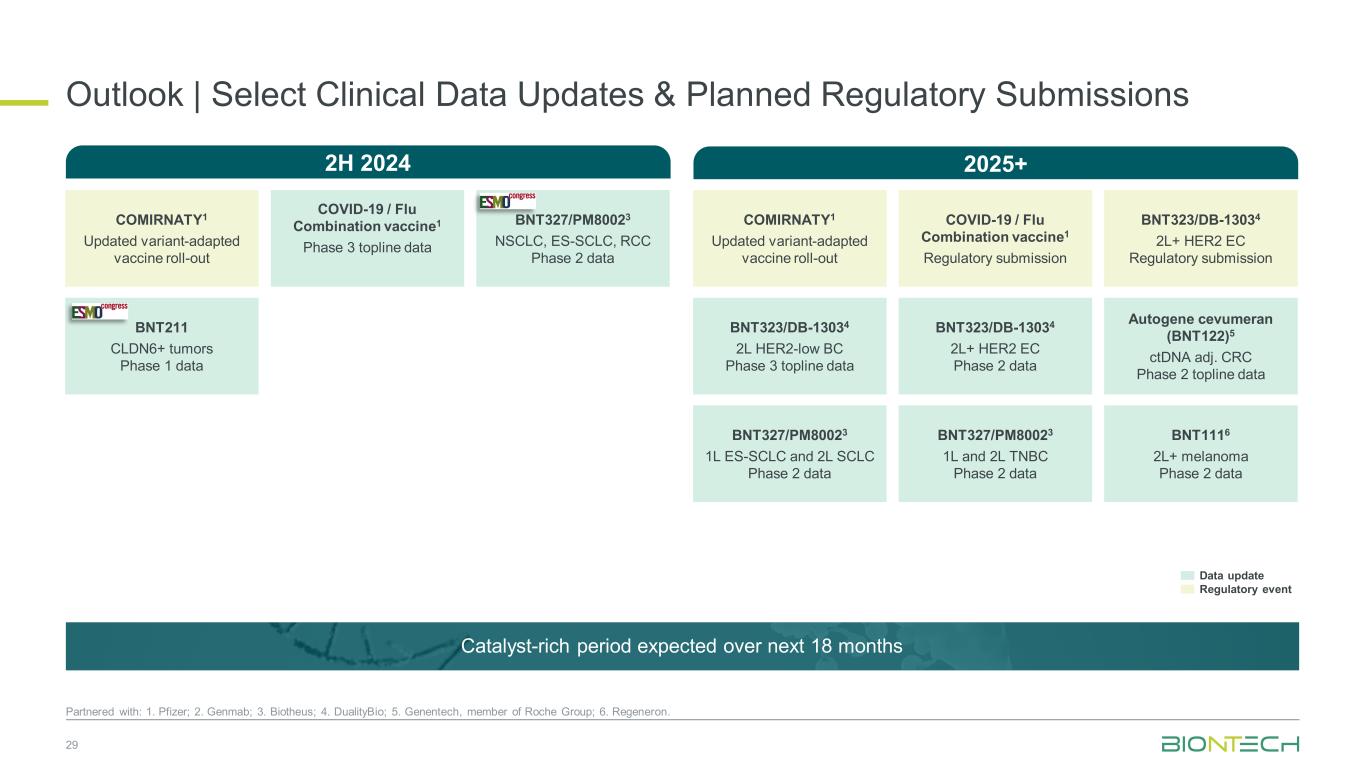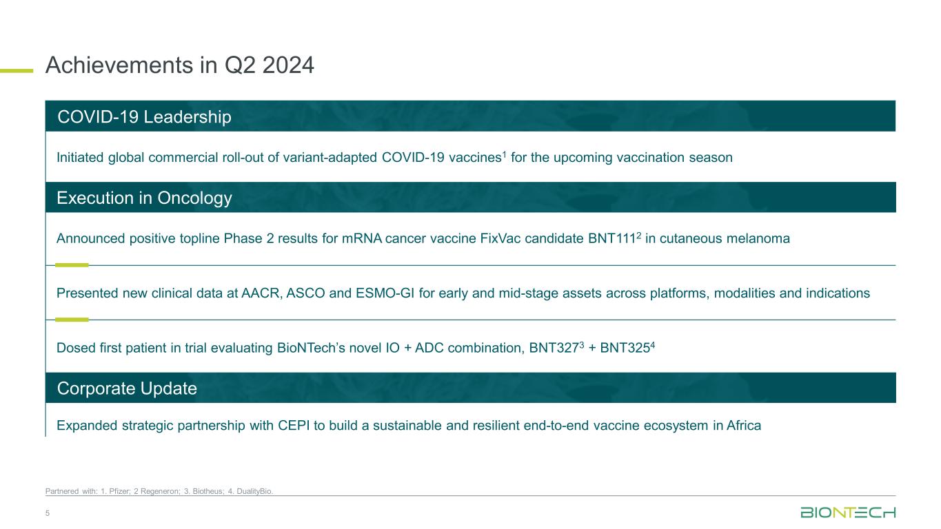 2024年第二季度的成就5与:1合作。辉瑞;2个再生元制药;3。Biotheus;4。DualityBio。在AACR、ASCO和ESMO-GI上展示了跨平台、模式和适应症的早期和中期资产的新临床数据,为评估BioNTech新型IO + ADC组合的试验中的第一位患者给药,BNT3273 + BNT3254为即将到来的疫苗接种季启动了变异适应新冠疫苗1的全球商业推广公司更新扩大与CEPI的战略合作伙伴关系,以在非洲建立一个可持续和有弹性的端到端疫苗生态系统,宣布mRNA癌症疫苗FixVAC候选疫苗BNT1112在皮肤黑色素瘤执行中的积极顶线2期结果在肿瘤学新冠领