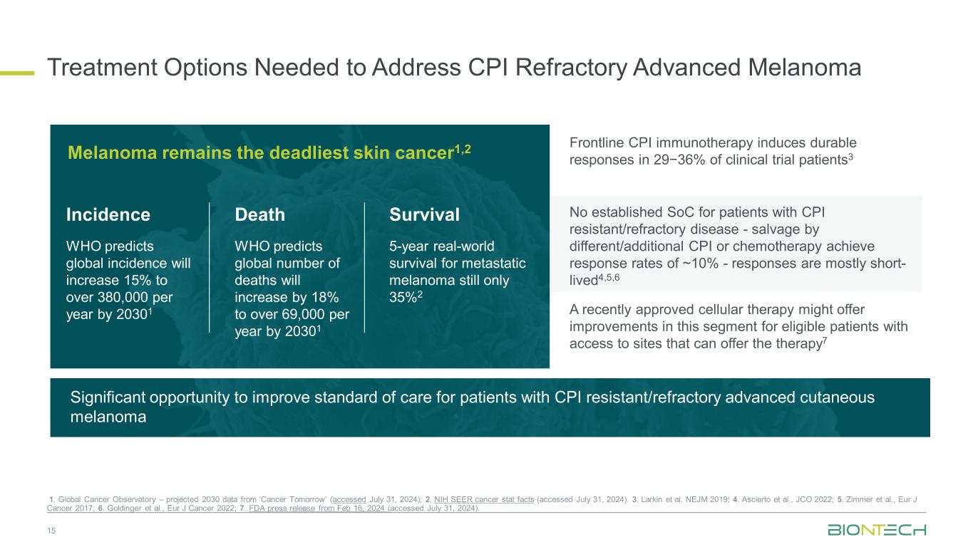一线CPI免疫疗法在29 − 36%的临床试验患者中诱导持久应答3未建立针对CPI耐药/难治性疾病患者的SoC-通过不同/额外的CPI或化疗进行的挽救达到~10%的应答率-应答大多是短暂的4,5,6最近批准的细胞疗法可能会为符合条件的患者提供这一细分市场的改善,这些患者可以访问站点可以提供疗法7提高对CPI耐药/难治性晚期皮肤黑色素瘤患者护理标准的重要机会解决CPI难治性晚期黑色素瘤所需的治疗方案15黑色素瘤仍然是最致命的皮肤癌1,2发病率世卫组织预测,到2031年,全球发病率将增加15%,达到每年超过380,000例死亡人数世卫组织预测,到2031年,全球死亡人数将增加18%,达到每年超过69,000例,转移性黑色素瘤的5年实际生存率仍然只有35% 21。Global Cancer Observatory –‘Cancer Tomorrow’预测的2030年数据(2024年7月31日访问);2。NIH SEER癌症统计事实(2024年7月31日访问)。3.Larkin et al. NEJM 2019;4。Ascierto等人,JCO 2022;5。Zimmer et al.,EUR J Cancer 2017;6。Goldinger et al.,EUR J Cancer 2022;7。2024年2月16日FDA新闻稿(2024年7月31日访问)。