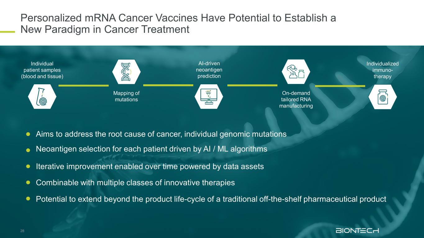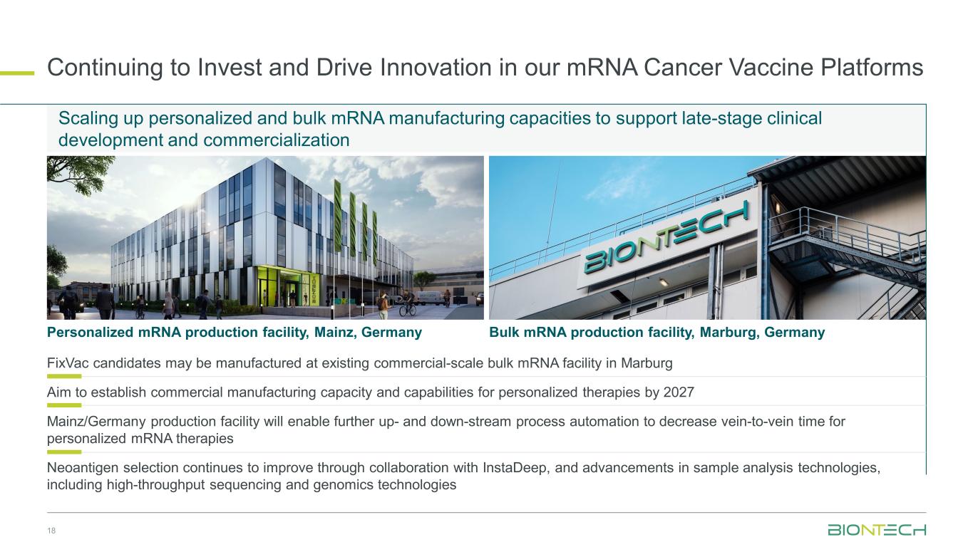 继续对我们的mRNA癌症疫苗平台进行投资并推动创新18个性化mRNA生产设施,德国美因茨德国马尔堡的批量mRNA生产设施FixVac候选药物可能会在马尔堡现有的商业规模批量mRNA设施中生产,旨在到2027年建立个性化疗法的商业制造能力和能力美因茨/德国的生产设施将能够进一步实现上游和下游流程自动化,以减少个性化mRNA疗法的静脉到静脉时间通过与InstaDeep的合作,以及样本分析技术的进步,新抗原选择继续得到改进,包括高通量测序和基因组学技术,扩大个性化和批量mRNA制造能力,以支持后期临床开发和商业化