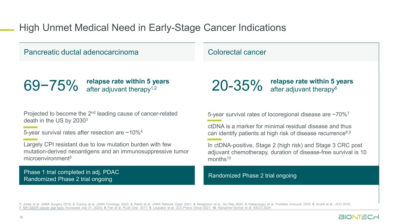早期癌症适应症中未满足的医疗需求高161。Jones et al. JAMA Surgery 2019;2。Conroy et al. JAMA Oncology 2022;3。Rahib et al. JAMA Network Open2021;4。Bengtsson et al.,Sci Rep 2020;5。Kabacaoglu et al. Frontiers Immunol 2018。6.Andr é等,JCO 2015;7。NIH SEER癌症统计事实(2024年7月31日访问);8。Fan et al. PLOS One 2017;9。Loupakis等JCO Precis Oncol 2021;10。Reinacher-Schick等人ASCO 2024。69 − 75%预计到20303年成为美国癌症相关死亡第二大原因切除后5年存活率~10% 4由于突变负担低、突变衍生的新抗原很少和具有免疫抑制性肿瘤微环境,对CPI有较大耐药性5 20-35 %的局域性疾病5年存活率~70% 7 ctDNA是最小残留疾病的标志物,因此可以识别出疾病复发的高风险患者8,9在CTDNA阳性、2期(高危)和3期CRC辅助化疗后,无病生存期持续时间为10个月10在adj完成1期试验PDAC随机2期试验进行中随机2期试验进行中胰腺导管腺癌结直肠癌辅助治疗后5年内复发率1,2辅助治疗后5年内复发率6