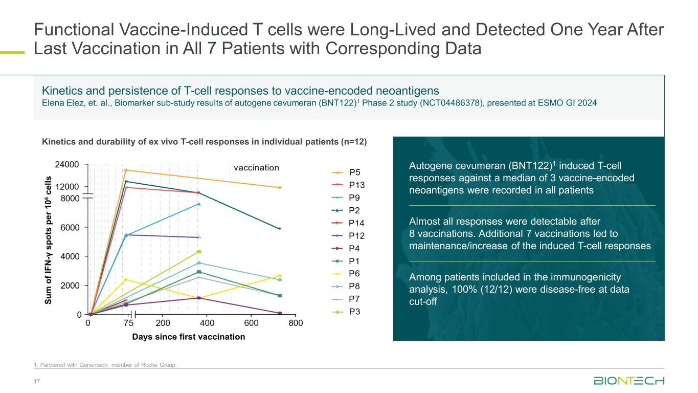 T细胞对疫苗编码的新抗原Elena Elez等人的动力学和持久性反应,在ESMO GI 2024上展示的自基因cevumeran(BNT122)1 2期研究(NCT04486378)的生物标志子研究结果在所有7名患者的最后一次接种后一年检测到的功能性疫苗诱导的T细胞均具有相应数据171。与罗氏集团成员Genentech合作。Autogene cevumeran(BNT122)1诱导的针对中位数3个疫苗编码新抗原的T细胞应答在所有患者中均有记录,在接种8次疫苗后几乎所有应答均可检测到。额外7次接种导致诱导T细胞应答维持/增加在纳入免疫原性分析的患者中,100%(12/12)在数据截止动力学和个体患者体外T细胞应答持久性(n = 12)下无病