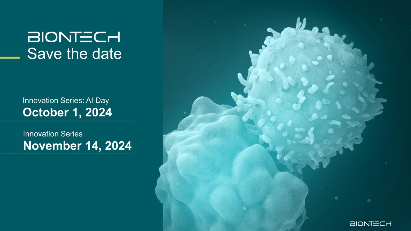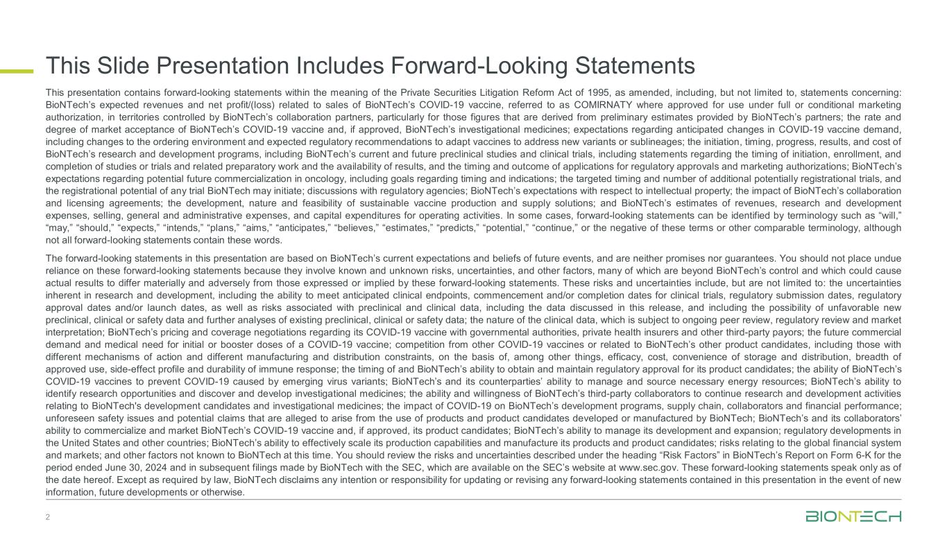 本幻灯片演示文稿包括前瞻性陈述2本演示文稿包含经修订的1995年《私人证券诉讼改革法案》含义内的前瞻性陈述,包括但不限于有关以下方面的陈述:BioNTech在BioNTech的合作伙伴控制的地区,特别是对于那些来自BioNTech合作伙伴提供的初步估计的数字的区域内,与BioNTech的新冠疫苗(简称COMIRNATY)的销售相关的预期收入和净利润/(亏损);以及,如果获得批准,BioNTech的在研药品;关于新冠疫苗需求预期变化的预期,包括订购环境的变化和预期的监管建议,以调整疫苗以应对新的变异株或亚谱系;BioNTech研发计划的启动、时间安排、进展、结果和成本,包括BioNTech当前和未来的临床前研究和临床试验,包括关于启动、注册、完成研究或试验及相关准备工作的时间安排和结果的可用性的声明,以及申请监管批准和上市许可的时间和结果;BioNTech对肿瘤学未来潜在商业化的预期,包括有关时间和适应症的目标;额外的潜在注册试验的目标时间和数量,以及BioNTech可能启动的任何试验的注册潜力;与监管机构的讨论;BioNTech对知识产权的期望;TERM1的合作和许可协议的影响;可持续疫苗生产和供应解决方案的开发、性质和可行性;以及BioNTech对收入、研发费用、销售、一般和管理费用以及经营活动资本支出的估计。在某些情况下,前瞻性陈述可以通过“将”、“可能”、“应该”、“预期”、“打算”、“计划”、“目标”、“预期”、“相信”、“估计”、“预测”、“潜在”、“继续”等术语来识别,或者这些术语或其他类似术语的否定,尽管并非所有前瞻性陈述都包含这些词语。本演示文稿中的前瞻性陈述基于BioNTech当前对未来事件的预期和信念,既不是承诺也不是保证。您不应过分依赖这些前瞻性陈述,因为它们涉及已知和未知的风险、不确定性和其他因素,其中许多超出了BioNTech的控制范围,可能导致实际结果与这些前瞻性陈述中明示或暗示的结果存在重大不利差异。这些风险和不确定性包括但不限于:研发中固有的不确定性,包括满足预期临床终点的能力、临床试验的开始和/或完成日期、监管提交日期、监管批准日期和/或启动日期,以及与临床前和临床数据相关的风险,包括本新闻稿中讨论的数据,包括可能出现不利的新的临床前、临床或安全性数据以及对现有临床前、临床或安全性数据的进一步分析;临床数据的性质,需接受正在进行的同行审查,监管审查和市场解读;BioNTech与政府当局、私人健康保险公司和其他第三方付款人就其新冠疫苗进行的定价和覆盖范围谈判;未来对新冠疫苗初始剂量或加强剂量的商业需求和医疗需求;来自其他新冠疫苗或与BioNTech其他产品候选者相关的竞争,包括那些具有不同作用机制和不同制造和分销限制的候选产品,这些竞争基于(其中包括)功效、成本、储存和分销的便利性、批准使用的广度,免疫反应的副作用概况和持久性;BioNTech获得和维持对其产品候选者的监管批准的时间安排以及能力;BioNTech的新冠疫苗预防由新出现的病毒变异株引起的新冠病毒的能力;BioNTech及其交易对手管理和采购必要能源资源的能力;BioNTech识别研究机会以及发现和开发研究药物的能力;BioNTech的第三方合作者继续进行与BioNTech的开发候选者和研究药物相关的研发活动的能力和意愿;新冠肺炎对BioNTech的开发计划、供应链、 合作者和财务业绩;据称因使用BioNTech开发或制造的产品和候选产品而产生的不可预见的安全问题和潜在索赔;BioNTech及其合作者将BioNTech的新冠疫苗商业化和营销的能力,如果获得批准,还将销售其候选产品;BioNTech管理其开发和扩张的能力;美国和其他国家的监管发展;BioNTech有效扩展其生产能力以及制造其产品和候选产品的能力;与全球金融体系和市场相关的风险;以及BioNTech目前未知的其他因素。您应该查看BioNTech截至2024年6月30日止期间的6-K表格报告中以及BioNTech随后向SEC提交的文件中“风险因素”标题下描述的风险和不确定性,这些文件可在SEC网站www.sec.gov上查阅。这些前瞻性陈述仅在本文发布之日发表。除法律要求外,如果出现新信息、未来发展或其他情况,BioNTech不承担更新或修改本演示文稿中包含的任何前瞻性陈述的任何意图或责任。