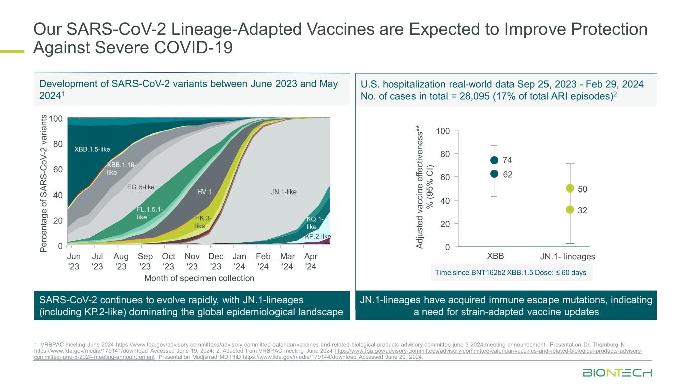 我们的SARS-CoV-2谱系适应疫苗有望提高对严重的新冠1的保护。VRBPAC会议2024年6月https://www.fda.gov/advisory-committee-calendar/vaccines-and-related-biological-products-advisory-committee-june-5-2024-meeting-announcement Presentation Thornburg博士N https://www.fda.gov/media/179141/download accessed June 19,2024;2。改编自VRBPAC会议2024年6月https://www.fda.gov/advisory-committee/advisory-committee-calendar/vaccines-and-related-biological-products-advisory-committee-june-5-2024-meeting-announcement Presentation Modjarrad MD博士https://www.fda.gov/media/179144/download于2024年6月20日访问。SARS-CoV-2继续快速进化,JN.1谱系(包括KP.2样)主导全球流行病学格局2023年6月至20241年5月间SARS-CoV-2变异株发展美国住院真实世界数据2023年9月25日-2024年2月29日总病例数= 28095(占总ARI发作的17%)自BNT162b2 XBB.1.5剂量:≤ 60天JN.1谱系获得免疫逃逸突变,表示需要用于毒株适应疫苗更新627432504060 XBB JN.1谱系Ad ju st ed v ac ci ne e ffe ct iv en es **%(95% C I)100802004060 PE rc en ta ge o f s AR S-C oV-2 v ar ia nt s 10080200 Sep‘23 Oct’23 Nov‘23 Dec’23 Jan‘24 Feb’24 Mar‘24 Apr’24 Aug‘23 Jul’23 Jun ' 23标本采集月XBB.1.5-like XBB.1.16-like FL.1.5.1-like EG.5-like HV.1 HK.3-喜欢JN-1-喜欢KP.2-喜欢KQ.1-喜欢