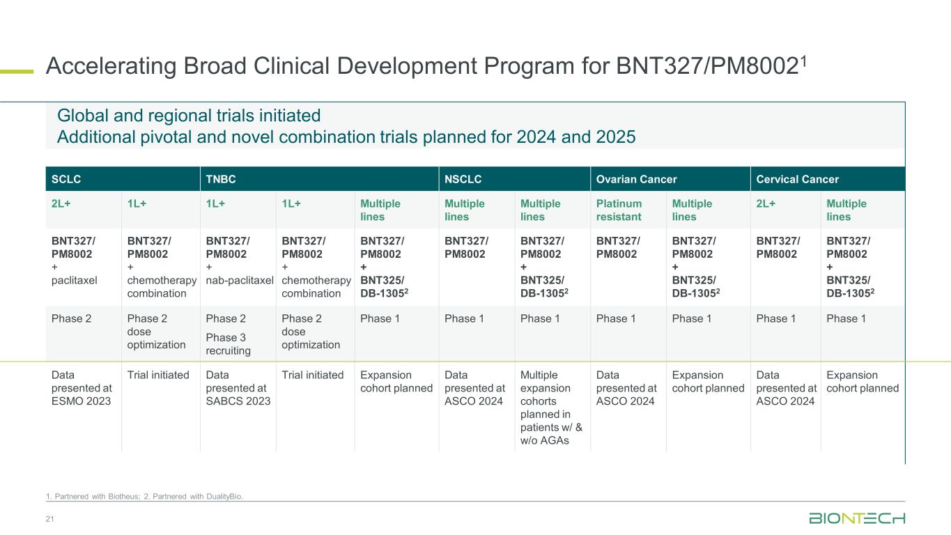加快BNT327/PM80021的广泛临床开发计划1。与Biotheus合作;2。与DualityBio合作。21 SCLC TNBC NSCLC卵巢癌宫颈癌2L + 1L + 1L + 1L +多线多线耐铂多线2L +多线BNT327/PM8002 +紫杉醇BNT327/PM8002 +化疗组合BNT327/PM8002 + nAB-紫杉醇BNT327/PM8002 +化疗组合BNT327/PM8002 + BNT325/DB-13052 BNT327/PM8002/PM8002 + BNT325/DB-13052 BNT327/PM8002/PM8002 + BNT325/DB-13052 BNT327/PM8002 + BNT325/DB-13052 BNT327/PM8002 BNT327在ESMO 2023试验启动上展示的数据在SABCS2023试验启动的扩展队列计划中展示的数据在ASCO 2024上展示的多个扩展队列计划在患者中w/& w/o AGAS上展示的数据在ASCO 2024上展示的扩展队列计划中展示的数据在ASCO 2024上展示的扩展队列计划中的全球和区域试验启动了计划在2024年和2025年进行的额外关键和新型组合试验