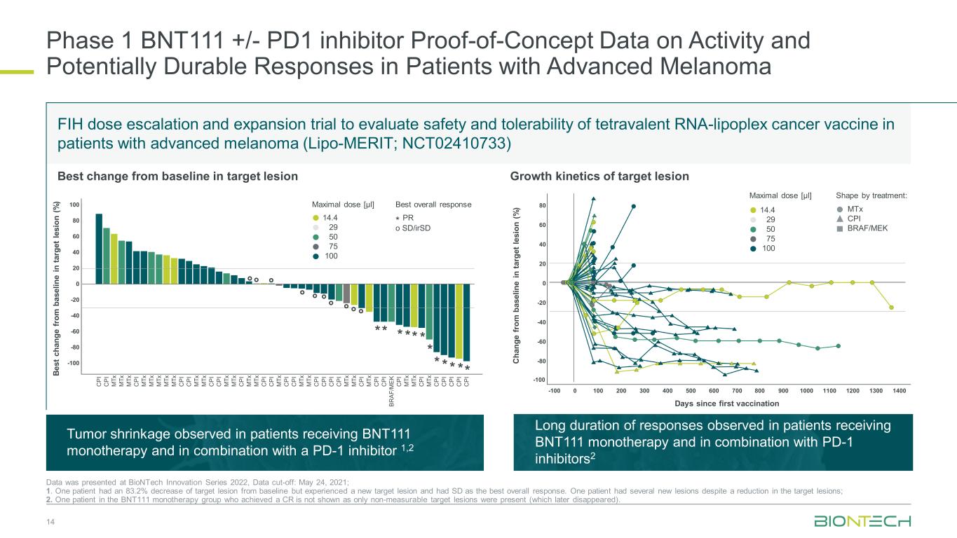 关于晚期黑色素瘤患者活性和潜在持久反应的1期BNT111 +/-PD1抑制剂概念验证数据14数据在2022年BioNTech创新系列会议上公布,数据截止:2021年5月24日;1。1例患者靶向病灶较基线减少83.2%,但经历了新的靶向病灶,SD为最佳总体反应。1名患者尽管目标病灶减少,但仍有几个新病灶;2。BNT111单药治疗组的1名患者实现了CR,未显示为仅存在不可测量的目标病变(后来消失)。Be ST c ha ng e fr om bas el in e in ta rg et le si on(%)Best change from baseline in target levion ° ° ° * * * ° * * * * * ° * * ° ° ° C PI C PI M tx m tx m tx m tx m tx m tx m tx m tx m tx m tx m tx m tx m tx m tx m tx m tx m tx m tx m tx m tx m tx m tx m tx m tx m tx m tx m tx m tx m tx m tx m tx m tx m tx m tx m tx m tx m tx m tx mTX M TX C PI C PI C PI M TX M TX C PI C PI M TX M TX C PI BR AF/M EK C PI M TX C PI C PI C PI C PI C PI 1008040200-20-40-60-80-100 60靶病变生长动力学14.4295075100最大剂量[ μ l ] * PR o SD/irSD最佳总反应C ha ng e fr om bas el in e in ta rg et le si on(%)8040200-20-40-60-80 60-100-100 01002003004005006007008009001000110012001300140014.4295075100最大剂量[ μ l ] MTx CPI BRAF/MEK形状通过治疗:自首次接种以来的天数FIH-剂量递增和扩展试验评估四价RNA-脂复合癌疫苗在晚期黑色素瘤(Lipo-MERIT;NCT02410733)患者中的安全性和耐受性接受BNT111单药治疗的肿瘤缩小观察并与PD-1抑制剂联合使用1,2在接受BNT111单药治疗和与PD-1抑制剂联合使用的患者中观察到长时间的应答2