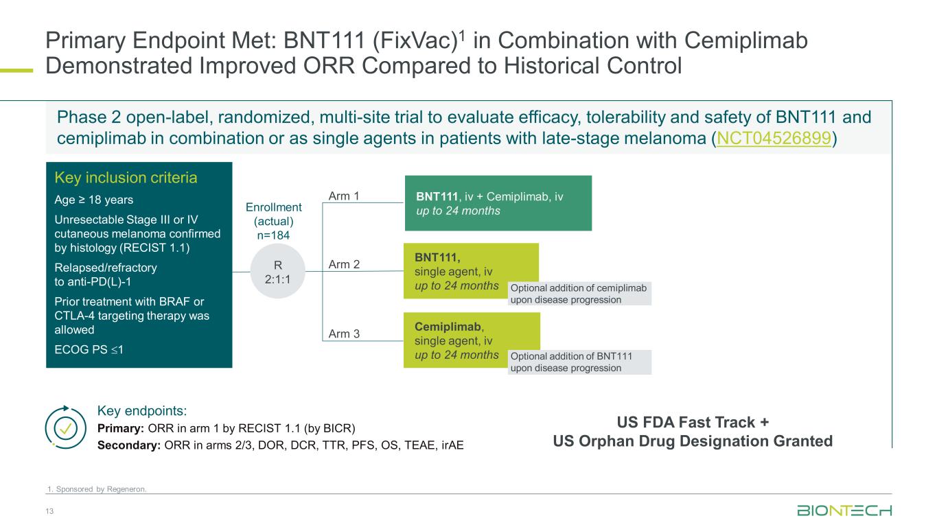 主要终点Met:与历史对照1相比,BNT111(FixVAC)1与Cemiplimab联合显示ORR有所改善。由再生元制药赞助。13个关键终点:BNT111,iv + Cemiplimab,iv长达24个月关键纳入标准年龄≥ 18岁经组织学(RECIST 1.1)确认的不可切除的III或IV期皮肤黑色素瘤复发/抗PD难治(L)-1之前接受BRAF或CTLA-4靶向治疗允许ECOG PS ≤ 1 R 2:1:1入组(实际)n = 184 BNT111,单药,iv长达24个月的Cemiplimab,单药,iv长达24个月的2期开放标签、随机、多地点试验评估疗效,BNT111和cemiplimab联合使用或作为单药在晚期黑色素瘤患者中的耐受性和安全性(NCT04526899)疾病进展时可选添加cemiplimab美国FDA快速通道+美国孤儿药指定授予arm 1 arm 3 arm 2主要:ORR in arm 1 by RECIST 1.1(by BICR)次要:ORR in arms 2/3,DOR,DCR,TTR,PFS,OS,TEAEE,iRAE疾病进展时可选添加BNT111