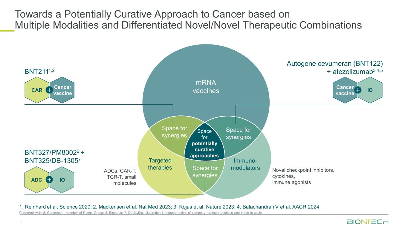 迈向一种基于多种模式和差异化的新型/新型治疗组合的潜在治疗癌症方法81。Reinhard et al. Science 2020;2。Mackensen et al. Nat Med 2023;3。Rojas et al. Nature 2023;4。Balachandran V等人AACR 2024。合作伙伴:5。Genentech,罗氏集团成员;6。Biotheus;7。DualityBio。图解代表了公司的战略重点,并不是为了扩大规模。CAR癌症疫苗+ IOCancer疫苗+ ADC IO + Autogene Cevumeran(BNT122)+ atezolizumab3,4,5 BNT327/PM80026 + BNT325/DB-13057 ADCs、CAR-T、TCR-T、小分子新型检查点抑制剂、细胞因子、免疫激动剂BNT2111,2 mRNA疫苗靶向治疗免疫调节剂协同作用空间潜在治疗方法空间协同作用空间