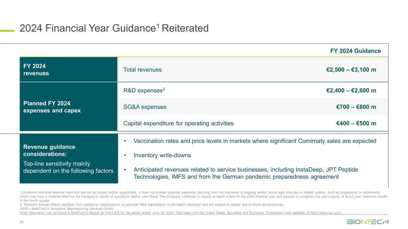 2024财年指引1重申25财年2024收入总收入2,500欧元– 3,100百万欧元2024财年计划费用和资本支出研发费用2,400欧元– 2,600百万欧元SG & A费用700欧元– 8亿欧元经营活动资本支出400欧元– 5亿欧元2024财年指导收入指导考虑:顶线敏感性主要取决于以下因素•疫苗接种率和市场价格水平,预计会有显着的共同销售额•库存减记•与服务业务相关的预期收入,包括InstaDeep、JPT Peptide Technologies,国际货币基金组织和德国疫情防备协议1.Guidance排除了尚不知道和/或无法量化的外部风险。它不包括可能对公司的经营业绩和/或现金流量产生重大影响的持续和/或未来法律纠纷或相关活动的结果所产生的潜在付款,例如判决或和解。该公司继续预计2024财年将出现亏损,并预计大部分全年收入将在第四季度确认。2.数字包括在披露范围内从额外合作或潜在并购交易中确定的影响,并可能因未来发展而更新。IMFS = BioNTech的创新制造服务有限公司更多信息,请参见BioNTech今天向美国证券交易委员会提交的截至2024年6月30日止的6-K表格报告,可在https://www.sec.gov/查阅。
