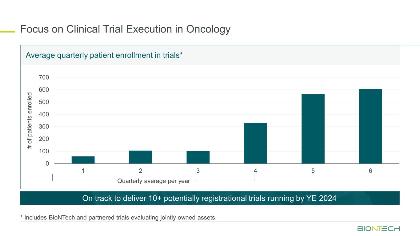 专注于肿瘤领域的临床试验执行*包括BioNTech和评估共同拥有资产的合作试验。0100200300400500600700123456试验的平均季度患者入组* # p at ie nt s en ro lle d每年的季度平均*包括BioNTech和合作试验,这些试验有望在YE 2024之前交付10 +项潜在的注册试验