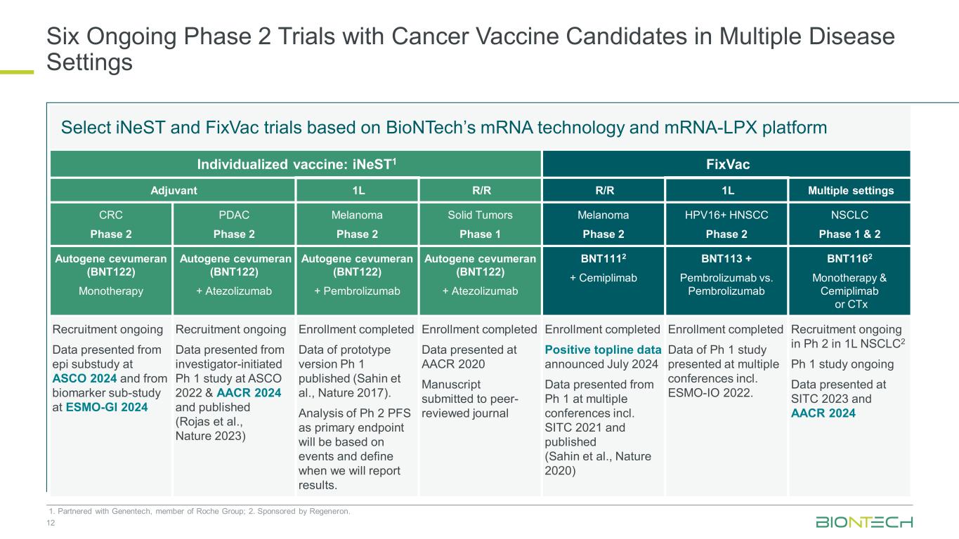 与多种疾病环境中的癌症疫苗候选者进行的六个正在进行的2期试验121。与罗氏集团成员Genentech合作;2。由再生元制药赞助。个体化疫苗:iNEST1 FixVac佐剂1L R/R R/R 1L多种设置CRC 2期PDAC 2期黑色素瘤2期实体瘤1期黑色素瘤2期HPV16 + HNSCC 2期NSCLC 1期& 2期Autogene cevumeran(BNT122)单药治疗AutoGene cevumeran(BNT122)+ Atezolizumab AutoGene cevumeran(BNT122)+ pembrolizumab AutoGene cevumeran(BNT122)+ Atezolizumab BNT1112 + Cemiplimab BNT113 + Pembrolizumab vs. Pembrolizumab BNT1162单药治疗& Cemip以及来自ESMO-GI 2024招募中的生物标记子研究正在进行的数据来自ASCO 2022和AACR 2024上由研究者发起的PH1研究并已发布(Rojas等人,Nature 2023)的招募完成了原型版本PH1的数据已发布(Sahin等人,Nature 2017)。作为主要终点的PH2 PFS分析将基于事件并定义我们何时报告结果。在AACR 2020上提交给同行评审期刊的稿件上提交的已完成注册数据已完成2024年7月公布的正面顶线数据数据数据来自PH 1在多个会议上提交的数据,包括。SITC 2021并发表(Sahin等,Nature 2020)在多个会议上提交的PH1研究的注册完成数据,包括。ESMO-IO 2022。在1L NSCLC2 PH1研究中PH2的招募正在进行中数据在SITC 2023和AACR 2024上展示基于BioNTech的mRNA技术和mRNA-LPX平台的Select iNEST和FixVac试验