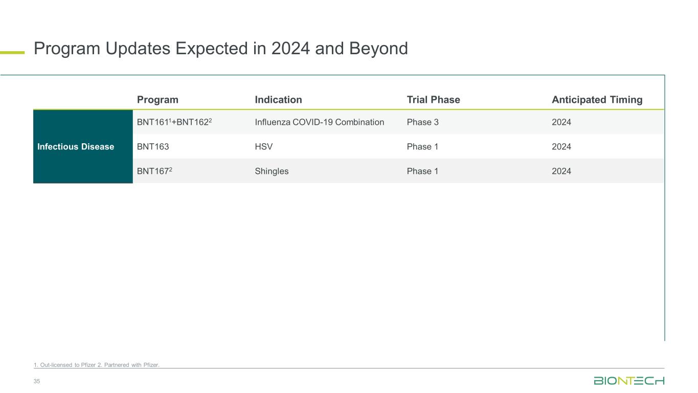 预计2024年及之后的计划更新351。已授权给辉瑞 2。与辉瑞合作。程序适应症试验阶段预期时机传染病BNT1611 + BNT1622流感新冠联用3期2024 BNT163 HSV 1期2024 BNT1672带状疱疹1期2024