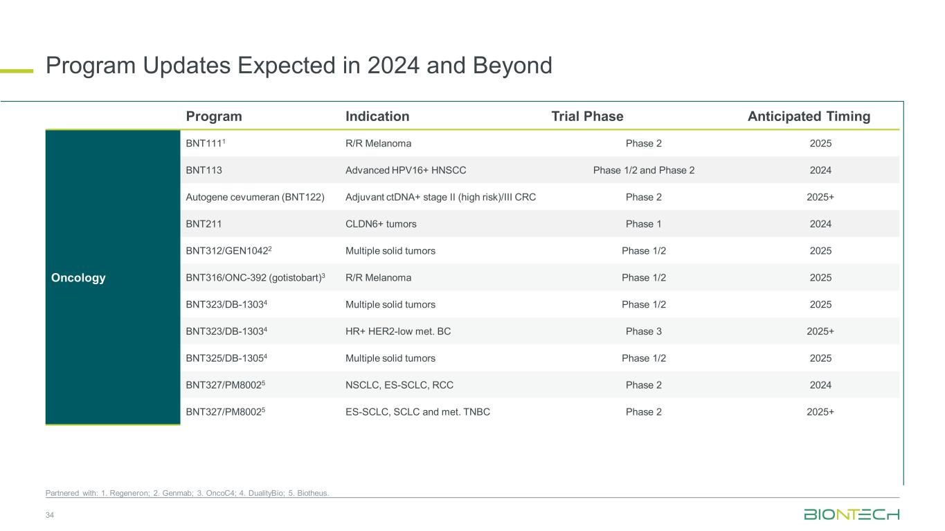 方案适应症试验阶段预期时机肿瘤学BNT1111 R/R黑色素瘤2期2025 BNT113晚期HPV16 + HNSCC 1/2期和2期2024 Autogene Cevumeran(BNT122)佐剂CTDNA + II期(高危)/III期CRC 2期2025 + BNT211 CLDN6 +肿瘤1期2024 BNT312/GEN10422多个实体瘤1期2025 BNT316/ONC-392(gotistobart)3 R/R黑色素瘤1期2 2025 BNT323/DB-13034多个实体瘤1期2 2025 BNT323/DB-13034 HR + HER2-low满足。BC 3期2025 + BNT325/DB-13054多重实体瘤1/2期2025 BNT327/PM80025 NSCLC、ES-SCLC、RCC 2期2024 BNT327/PM80025 ES-SCLC、SCLC并满足。TNBC Phase 2 2025 +计划更新预计在2024年及34年后与:1。再生元制药;2。Genmab;3。OncoC4;4。DualityBio;5。Biotheus。