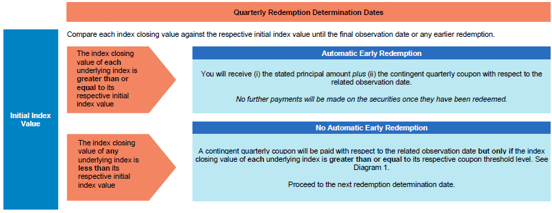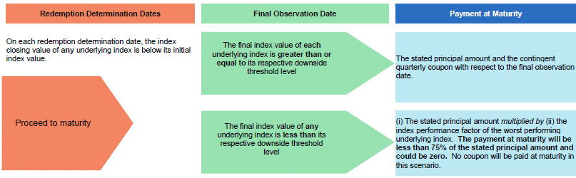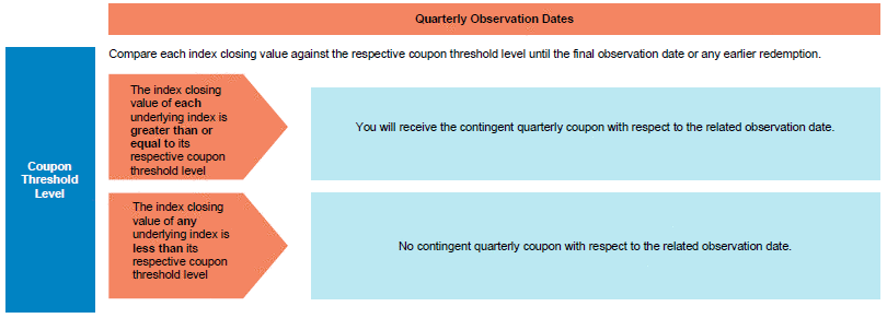 如果每个基础指数的最终指数值大于或等于其各自的下行阈值水平,投资者将获得规定的本金金额加上与最终观察日相关的或有季度票息。