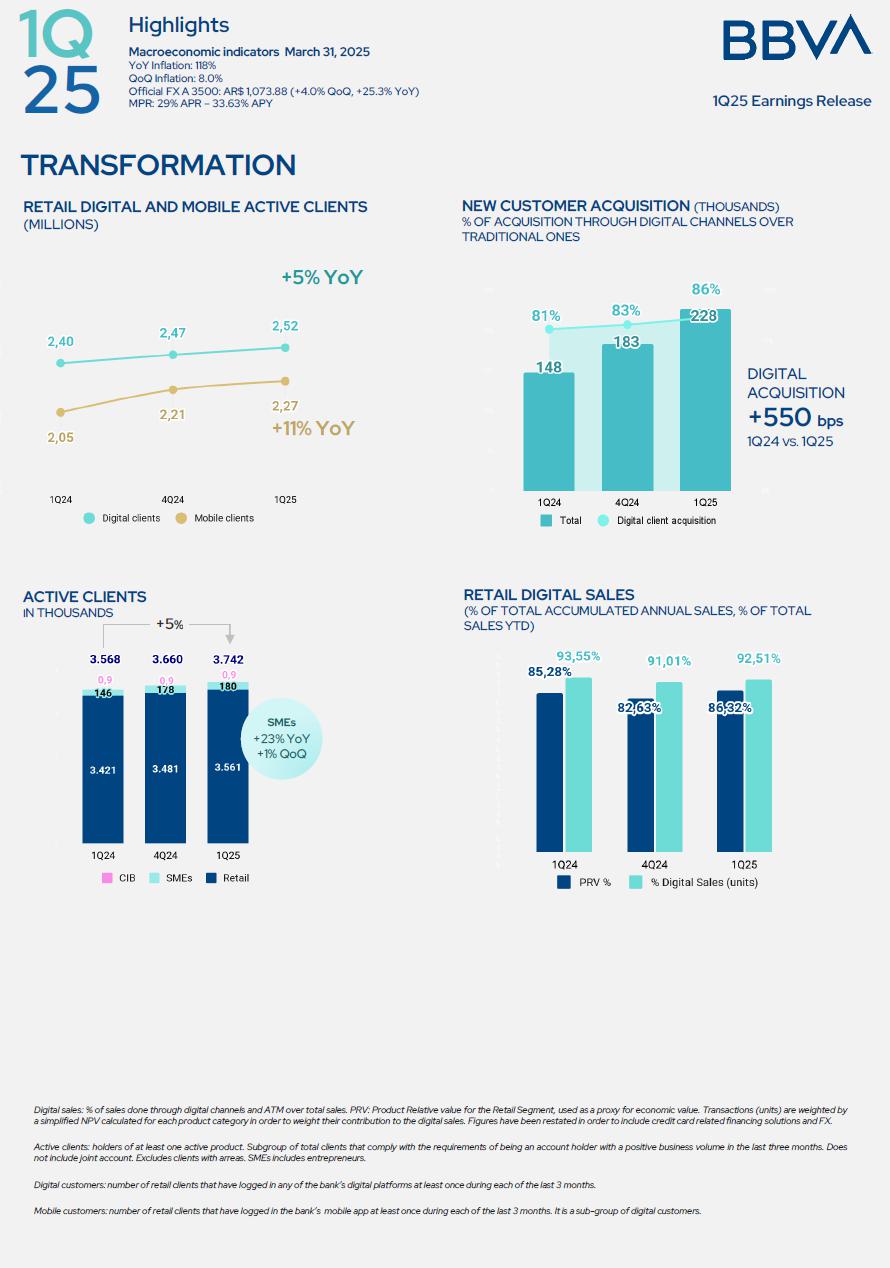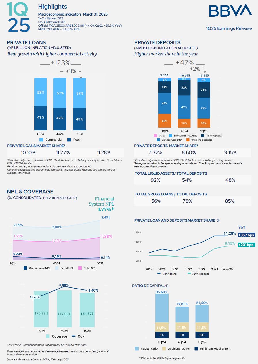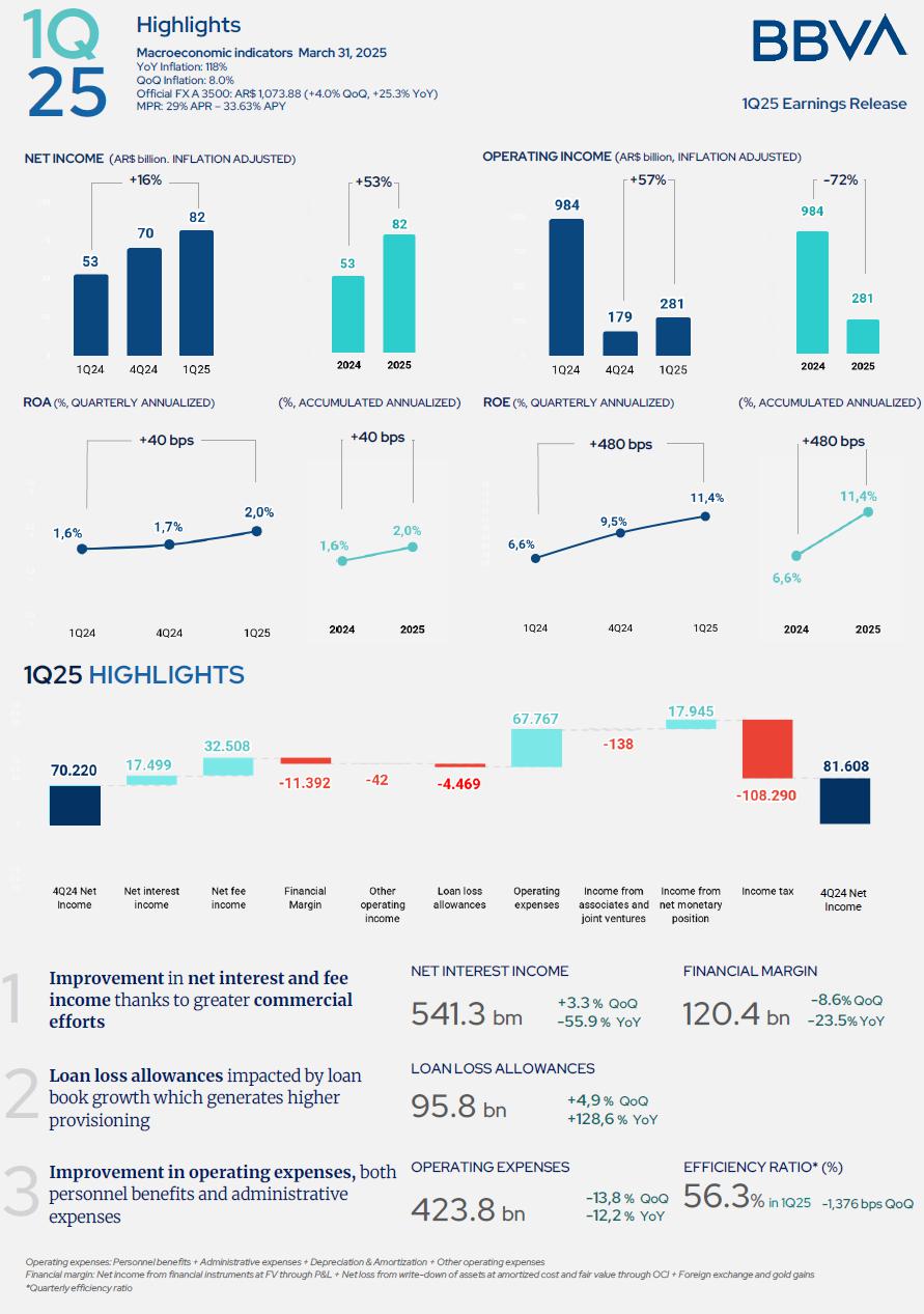 | · | 2025年第一季度,BBVA阿根廷公布经通胀调整后的平均资产回报率(ROAA)为2.0%,上一季度为1.7%,经通胀调整后的平均股本回报率(ROAE)为11.4%,上一季度为9.5%。 |