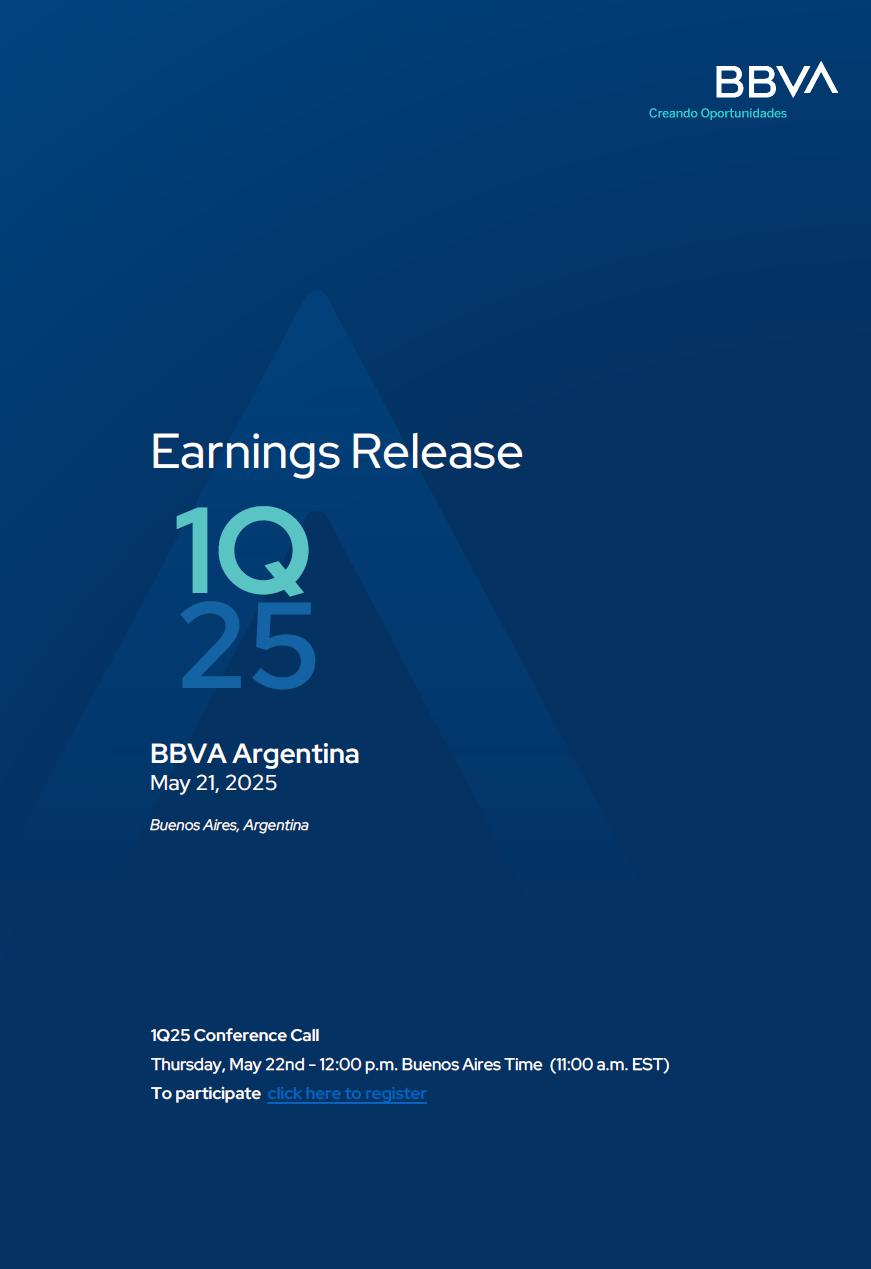 布宜诺斯艾利斯,2025年5月21日– Banco BBVA Argentina S.A(NYSE;BYMA;MAE:BBAR;LATIBEX:XBBAR)(“BBVA ] Argentina”或“BBVA”或“本行”)今天公布了截至2025年3月31日的第一季度(2025年第一季度)综合业绩。
