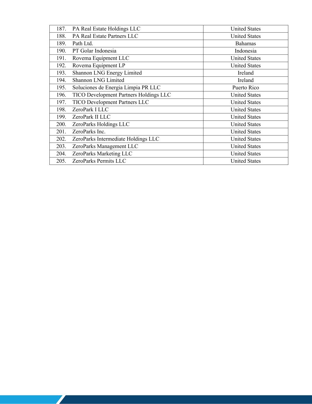 187.PA Real Estate Holdings LLC美国188。PA Real Estate Partners LLC美国189。Path Ltd.巴哈马190。PT Golar印尼印尼191。Rovema Equipment LLC美国192。Rovema Equipment LP美国193。香农液化天然气能源有限公司爱尔兰194。香农液化天然气有限公司爱尔兰195。Soluciones de Energia Limpia PR LLC波多黎各196。TICO Development Partners Holdings LLC美国197。TICO Development Partners LLC美国198。ZeroPark I LLC美国199。ZeroPark II LLC美国200。ZeroParks Holdings LLC美国201。ZeroParks Inc.美国202。ZeroParks Intermediate Holdings LLC美国203。ZeroParks Management LLC美国204。ZeroParks Marketing LLC美国205。ZeroParks Permits LLC美国