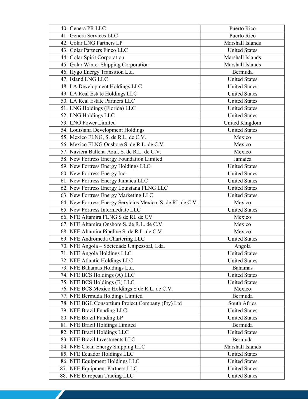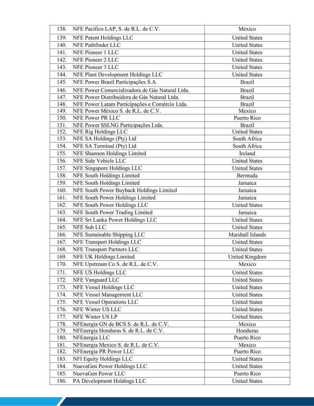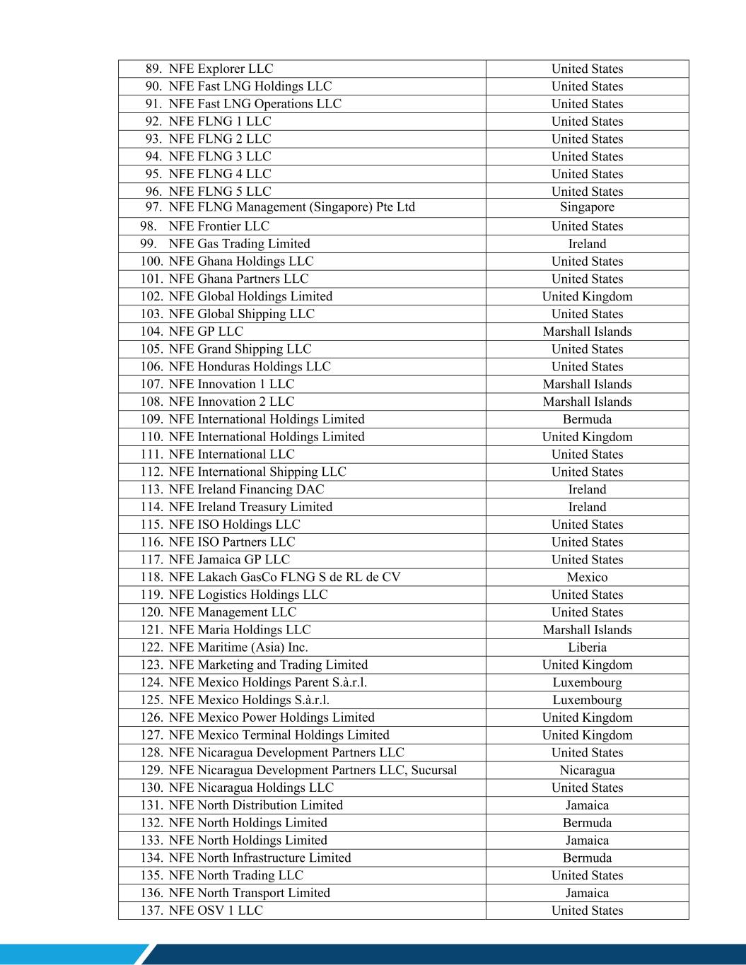138.NFE Pacifico LAP,S. de R.L. de C.V.墨西哥139。NFE专利控股有限责任公司美国140。NFE Pathfinder LLC美国141。NFE Pioneer 1 LLC美国142。NFE先锋2 LLC美国143。NFE Pioneer 3 LLC美国144。NFE Plant Development Holdings LLC美国145。NFE Power Brasil Participa çõ es S.A.巴西146。NFE Power Comercializadora de G á s Natural Ltda。巴西147。NFE Power Distribuidora de G á s Natural Ltda。巴西148。NFE Power Latam Participa çõ es e Com é rcio Ltda。巴西149。NFE Power M é xico S. de R.L. de C.V.墨西哥150。NFE Power PR LLC波多黎各151。NFE电力SSLNG Participa çõ es Ltda。巴西152。NFE Rig Holdings LLC美国153。NFE SA Holdings(Pty)Ltd南非154。NFE SA Terminal(Pty)Ltd南非155。NFE Shannon Holdings Limited爱尔兰156。NFE Side Vehicle LLC美国157。NFE Singapore Holdings LLC美国158。NFE南方控股有限公司百慕大159。NFE南方控股有限公司牙买加160。NFE South Power Buyback Holdings Limited牙买加161。NFE South Power Holdings Limited牙买加162。NFE South Power Holdings LLC美国163. NFE丨NFE丨NFE丨NFE丨NFE丨NFE丨NFE丨NFE丨NFE丨NFE NFE NFE NFE NFE NFE NFE NFE NFE NFE NFE NFE NFE NFENFE South Power Trading Limited牙买加164。NFE Sri Lanka Power Holdings LLC美国165。NFE Sub LLC美国166。NFE可持续航运有限责任公司马绍尔群岛167。NFE运输控股有限责任公司美国168。NFE运输合作伙伴有限责任公司美国169。NFE英国控股有限公司英国170。NFE上游公司S. de R.L. de C.V.墨西哥171。NFE US Holdings LLC美国172。NFE Vanguard LLC美国173。NFE Vessel Holdings LLC美国174。NFE Vessel Management LLC美国175。NFE船舶运营有限责任公司美国176。NFE Winter US LLC美国177。NFE Winter US LP美国178。NFENerg í a GN de BCS S. de R.L. de C.V.墨西哥179。NFEnergia洪都拉斯S. de R.L. de C.V.洪都拉斯180。NFEnergia LLC波多黎各181。NFEnergia Mexico S. de R.L. de C.V.墨西哥182。NFEnergia PR Power LLC波多黎各183。NFI Equity Holdings LLC美国184。NuevaGen Power Holdings LLC美国185。NuevaGen Power LLC波多黎各186。PA Development Holdings LLC美国