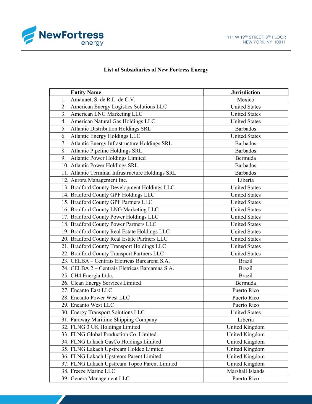 New Fortress Energy下属企业名单实体名称管辖范围1。Amaunet,S. de R.L. de C.V.墨西哥2。美国能源物流解决方案有限责任公司美国3。美国液化天然气营销有限责任公司美国4。美国天然气控股有限责任公司美国5。Atlantic Distribution Holdings SRL巴巴多斯6。Atlantic Energy Holdings LLC美国7。Atlantic Energy Infrastructure Holdings SRL巴巴多斯8。Atlantic Pipeline Holdings SRL巴巴多斯9。Atlantic Power控股有限公司百慕大10。Atlantic Power控股公司SRL巴巴多斯11。Atlantic Terminal Infrastructure Holdings SRL巴巴多斯12。Aurora Management Inc.利比里亚13。布拉德福德县发展控股有限责任公司美国14。布拉德福德县GPF控股有限责任公司美国15。布拉德福德县GPF Partners LLC美国16。布拉德福德县液化天然气营销有限责任公司美国17。布拉德福德县电力控股有限责任公司美国18。Bradford County Power Partners LLC美国19。布拉德福德县房地产控股有限责任公司美国20。Bradford County Real Estate Partners LLC美国21。Bradford County Transport Holdings LLC美国22。Bradford County Transport Partners LLC美国23。CELBA – Centrais El é tricas Barcarena S.A.巴西24。CELBA 2 – Centrais Eletricas Barcarena S.A.巴西25。CH4 Energia Ltda。巴西26。Clean 美国能源服务 Limited百慕大27。Encanto East LLC波多黎各28。Encanto Power West LLC波多黎各29。Encanto West LLC波多黎各30。Energy Transport Solutions LLC美国31。远方海运公司利比里亚32。FLNG 3英国控股有限公司英国33。FLNG全球生产有限公司英国34。FLNG Lakach GasCo Holdings Limited英国35。FLNG Lakach Upstream Holdco Limited英国36。FLNG Lakach Upstream Parent Limited英国37。FLNG Lakach Upstream Topco Parent Limited英国38。冻结海洋有限责任公司马绍尔群岛39。Genera Management LLC Puerto Rico 111 W 19th Street,8th Floor New York,NY 10011