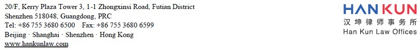 | (2) | 并购规则。并购规则,指中国公司或个人直接或间接设立或控制的境外特殊目的机构的证券在境外证券交易所上市交易前,须经中国证监会批准及透过收购该等中国公司或个人持有的中国国内权益而为海外上市而成立。基于我们对中国法律明确规定的理解,我们认为此次发行不需要获得中国证监会的事先批准。然而,有关《并购规则》、其他中国法律以及未来中国法律和法规的解释和适用存在重大不确定性,并且不能保证任何政府机构不会采取与我们在此陈述的观点相反或不同的观点。 |