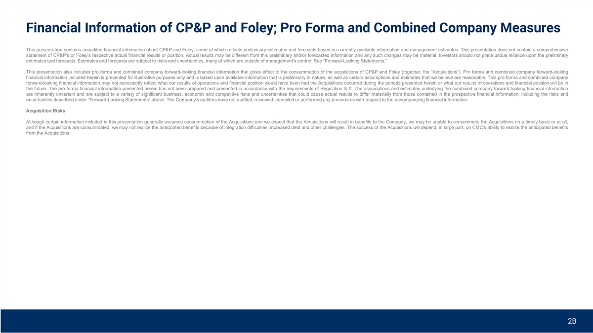 CP & P和Foley的财务信息;备考和合并后的公司措施本演示文稿包含有关CP & P和Foley的未经审计的财务信息,其中一些信息反映了基于当前可用信息和管理层估计的初步估计和预测。本演示文稿不包含CP & P或Foley各自实际财务业绩或状况的全面陈述。实际结果可能与此初步和/或预测信息不同,任何此类变化都可能是重大的。投资者不应过分依赖初步估计和预测。估计和预测受到风险和不确定性的影响,其中许多风险和不确定性超出了管理层的控制范围。见“前瞻性陈述”。该演示文稿还包括备考和合并的公司前瞻性财务信息,这些信息使完成对CP & P和Foley的收购(合称“收购”)生效。此处包含的备考和合并后的公司前瞻性财务信息仅用于说明目的,并基于初步性质的现有信息,以及我们认为合理的某些假设和估计。这些备考和合并后的公司前瞻性财务信息可能不一定反映如果收购发生在本文所述期间,我们的经营业绩和财务状况会是什么,或者我们未来的经营业绩和财务状况将是什么。此处提供的备考财务信息并未按照S-X条例的要求编制和呈报。合并后公司前瞻性财务信息所依据的假设和估计具有内在的不确定性,并受到各种重大业务、经济和竞争风险和不确定性的影响,这些风险和不确定性可能导致实际结果与前瞻性财务信息中包含的结果存在重大差异,包括上文“前瞻性陈述”中描述的风险和不确定性。本公司的核数师没有就所附财务资料进行审计、审查、编制或履行任何程序。收购风险尽管本演示文稿中包含的某些信息通常假设收购完成,并且我们预计收购将为公司带来好处,但我们可能无法及时或根本无法完成收购,并且如果收购完成,我们可能会因为整合困难、债务增加和其他挑战而无法实现预期的好处。收购的成功将在很大程度上取决于CMC实现收购预期收益的能力。2B