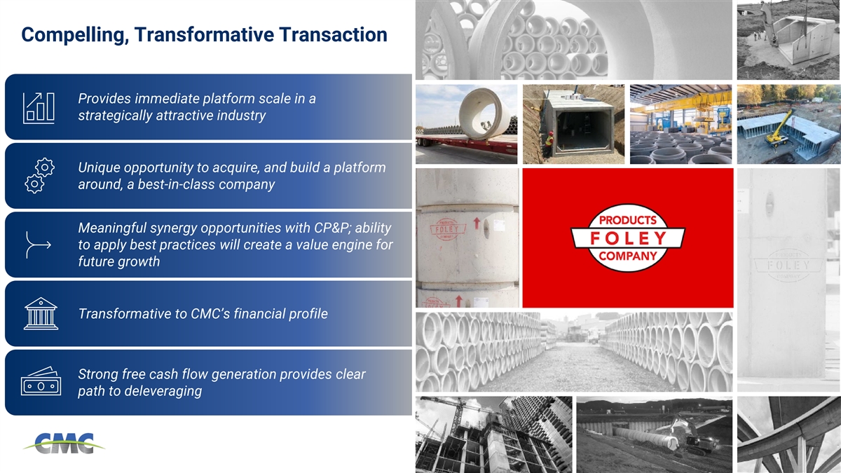 引人注目,变革性交易在具有战略吸引力的行业中提供即时的平台规模独特的收购机会,并围绕一流公司建立平台与CP & P的有意义的协同机会;应用最佳实践的能力将为未来增长创造价值引擎,对CMC的财务状况进行变革性的强大自由现金流产生为去杠杆化提供了明确的路径