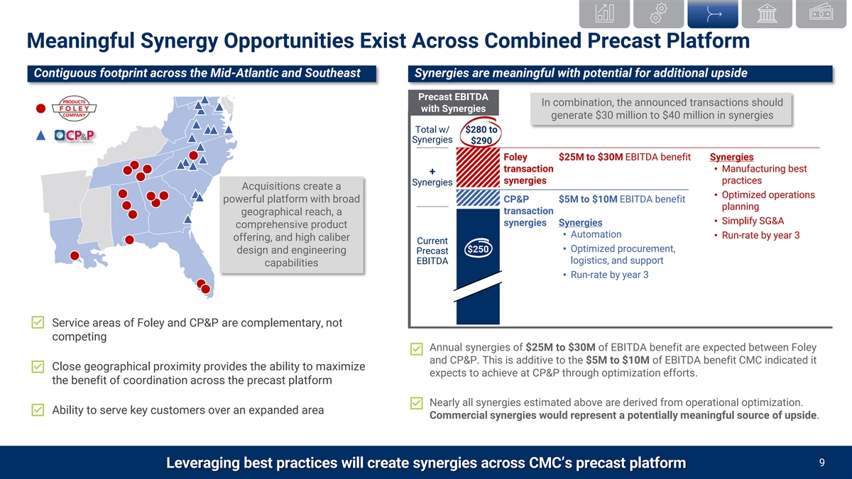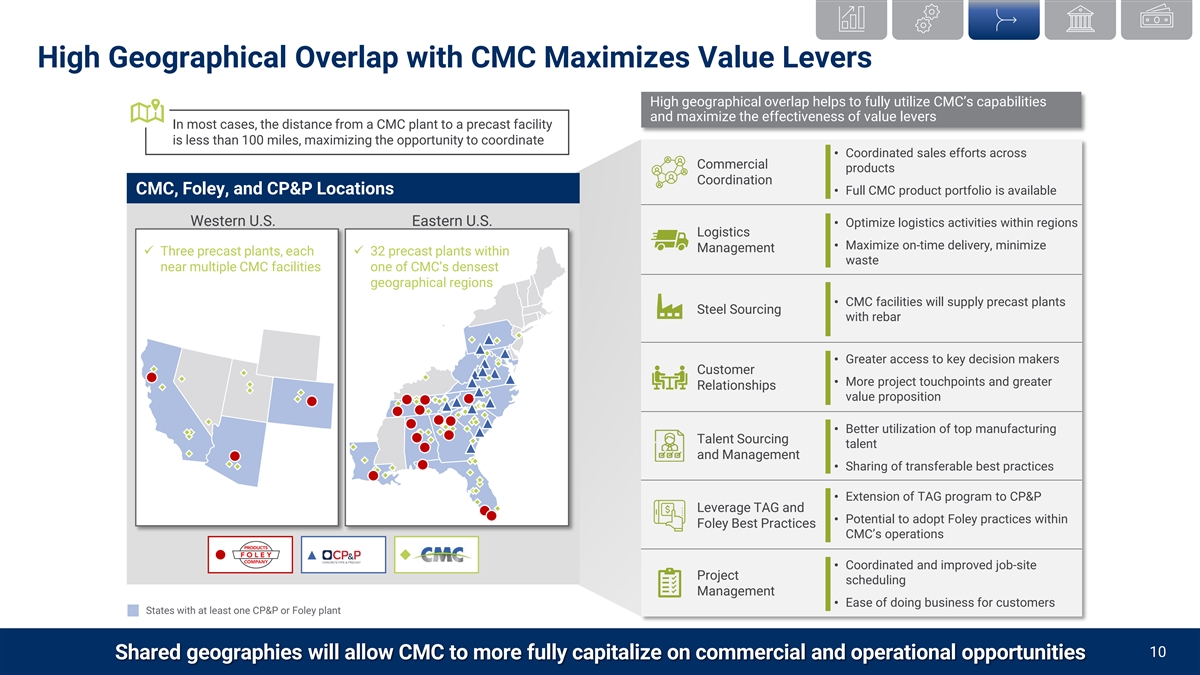 有意义的协同机会存在于整个联合预制平台横跨中大西洋和东南部的连续足迹协同作用是有意义的,有可能带来额外的上行预制EBITDA结合起来,已宣布的交易应与协同作用产生3000万至4000万美元的协同作用,总额为280美元至协同作用290美元福利2500万至3000万美元的EBITDA效益协同作用交易•制造最佳+协同作用实践协同作用收购创造了一个•优化运营的强大平台,具有广泛的CP & P 500万至1000万美元的EBITDA效益规划交易地域范围,a •简化SG & A协同作用协同作用综合产品•自动化•第3年提供的运行率,和高口径Current •优化采购、250美元的设计和工程预制物流,并支持EBITDA能力•按年运行率3 Foley和CP & P的服务领域是互补的,而不是竞争Foley和CP & P之间预计每年可产生2500万美元至3000万美元的EBITDA效益协同效应。这是对500万至1000万美元EBITDA收益的补充。CMC表示,地理位置接近提供了通过优化努力最大限度地提高CP & P预期实现的能力。整个预制平台的协调收益上述估计的几乎所有协同效应都来自运营优化。在扩大的区域内为关键客户提供服务的Ability将是一个潜在的有意义的上行空间来源。9利用最佳实践将在CMC的预制平台上产生协同效应