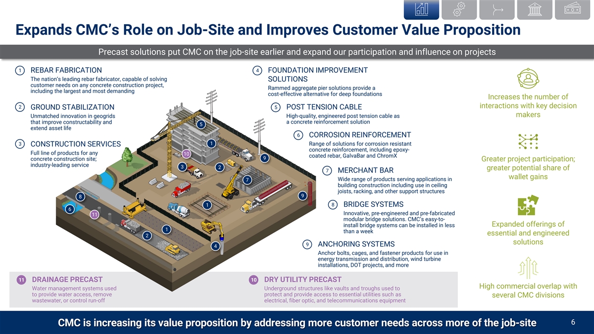 扩大CMC在作业现场的作用,提高客户价值主张Precast解决方案让CMC更早进入作业现场,扩大我们对项目的参与和影响力14 REBAR FABRICATION基础改进全国领先的螺纹钢制造商,能够在任何混凝土建筑项目上解决解决客户需求,夯实骨料墩解决方案为深基提供了一个包括最大和最具成本效益的替代方案,增加了与关键决策的交互次数25地面稳定后张力电缆制造商在土工格栅方面无与伦比的创新高质量,工程后张拉索作为提高可施工性和5延长资产寿命的混凝土钢筋解决方案6腐蚀强化13耐腐蚀建筑服务混凝土钢筋的3系列解决方案,包括环氧-任何10个涂层钢筋、GalvaBar和ChromX9混凝土施工现场的全线产品;更大的项目参与;行业领先的服务32更大的潜在份额7 MerCHANT BAR钱包获得广泛的产品服务于7个建筑施工中的应用,包括用于天花板托梁、货架和其他支撑结构9818桥梁系统6创新,预制预制11种模块化桥梁解决方案。CMC易于安装的桥梁系统可以安装在比一周更少的扩展产品中,即1个基本和工程2个解决方案9个锚定系统4个锚栓、网箱和紧固件产品,用于能源传输和分配、风力涡轮机安装、DOT项目和更多1110个排水预演干燥公用事业预演与使用的地下结构(如用于提供供水通道、移除保护并提供对几个CMC部门废水等基本公用事业的访问,或控制径流电气、光纤,和电信设备CMC收购X6 CMC正在通过在更多工作现场满足更多客户需求来增加其价值主张