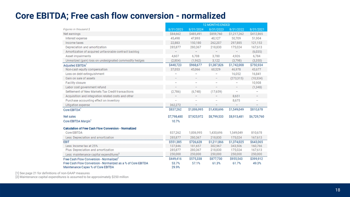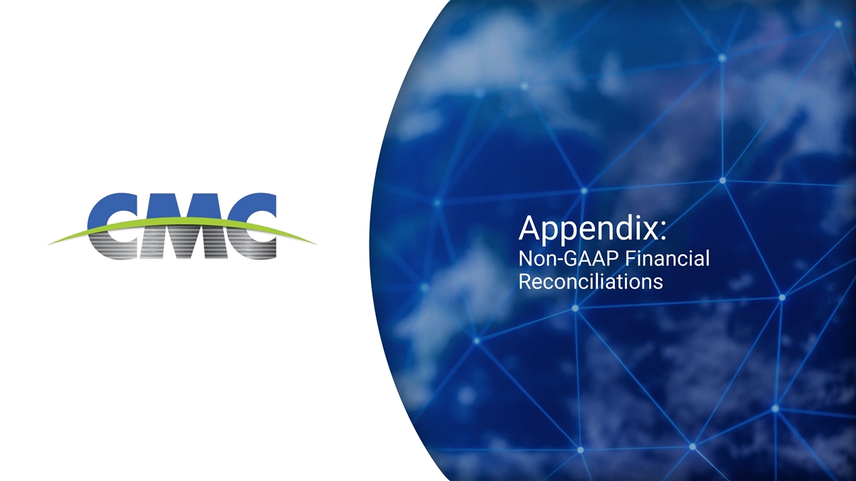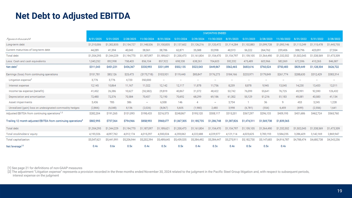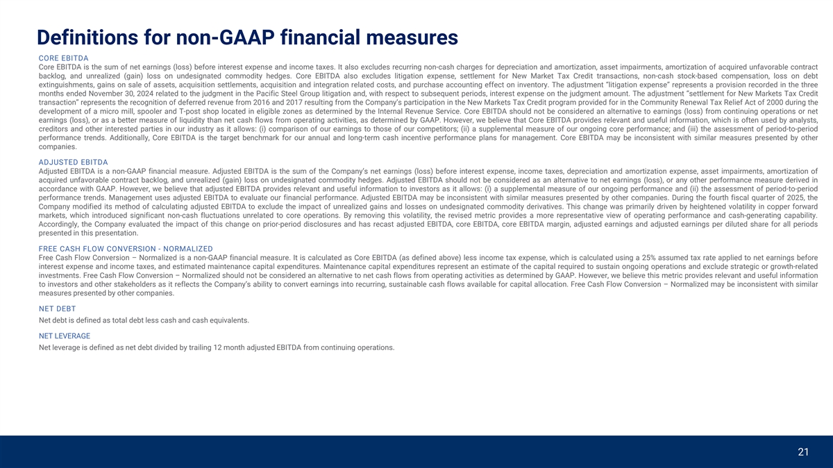 非GAAP财务指标的定义CORE EBITDA核心EBITDA是扣除利息费用和所得税前的净收益(亏损)之和。它还不包括折旧和摊销的经常性非现金费用、资产减值、已获得的不利合同积压的摊销以及未指定商品套期保值的未实现(收益)损失。核心EBITDA也不包括诉讼费用、新市场税收抵免交易的结算、非现金股票补偿、债务清偿损失、出售资产收益、收购结算、收购和整合相关成本以及采购会计对库存的影响。调整“诉讼费用”是截至2024年11月30日止三个月记录的与太平洋钢铁集团诉讼判决相关的拨备,以及就后续期间而言,判决金额的利息支出。调整“结算新市场税收抵免交易”是指公司参与2000年《社区更新税收减免法案》规定的新市场税收抵免计划所产生的2016年和2017年递延收入的确认,该计划是在美国国税局确定的位于符合条件的区域的微型磨机、盘管机和T柱店的开发过程中产生的。核心EBITDA不应被视为可替代持续经营收益(亏损)或净收益(亏损),或被视为比按公认会计原则确定的经营活动产生的净现金流量更好的流动性衡量标准。然而,我们认为,核心EBITDA提供了相关和有用的信息,我们行业的分析师、债权人和其他利益相关方经常使用这些信息,因为它允许:(i)将我们的收益与竞争对手的收益进行比较;(ii)对我们持续的核心业绩进行补充衡量;以及(iii)对期间业绩趋势的评估。此外,核心EBITDA是我们管理层年度和长期现金激励绩效计划的目标基准。核心EBITDA可能与其他公司提出的类似衡量标准不一致。调整后EBITDA调整后EBITDA是一种非公认会计准则财务指标。调整后EBITDA是公司扣除利息费用、所得税、折旧和摊销费用、资产减值、已获得的不利合同积压的摊销以及未指定商品套期保值的未实现(收益)损失前的净收益(亏损)之和。调整后的EBITDA不应被视为净收益(亏损)或根据公认会计原则得出的任何其他业绩衡量标准的替代方案。然而,我们认为,调整后的EBITDA为投资者提供了相关和有用的信息,因为它允许:(i)对我们持续业绩的补充衡量和(ii)对不同时期业绩趋势的评估。管理层使用调整后的EBITDA来评估我们的财务业绩。调整后的EBITDA可能与其他公司提出的类似衡量标准不一致。在2025年第四财季,公司修改了计算调整后EBITDA的方法,以排除未实现损益对未指定商品衍生品的影响。这一变化主要是由铜远期市场波动加剧推动的,这带来了与核心业务无关的显着非现金波动。通过消除这种波动性,修订后的指标提供了更具代表性的经营业绩和现金产生能力的观点。据此,公司评估了这一变化对前期披露的影响,并重新调整了本演示文稿中所有期间的调整后EBITDA、核心EBITDA、核心EBITDA利润率、调整后收益和调整后每股摊薄收益。自由现金流转换-正常化自由现金流转换–正常化是一种非公认会计准则财务指标。它的计算方法是核心EBITDA(定义见上文)减去所得税费用,这是使用25%的假设税率计算得出的,适用于扣除利息费用和所得税前的净利润,以及估计的维护资本支出。维护资本支出是对维持持续运营所需资本的估计,不包括战略或与增长相关的投资。自由现金流转换–正常化不应被视为公认会计原则确定的经营活动净现金流的替代方案。然而,我们认为这一指标为投资者和其他利益相关者提供了相关和有用的信息,因为它反映了公司将收益转化为可用于资本配置的经常性、可持续现金流的能力。自由现金流转换–正常化可能与其他公司提出的类似措施不一致。净债务净债务定义为总债务减去现金和现金等价物。净杠杆净杠杆定义为净债务除以来自持续经营业务的过去12个月调整后EBITDA。21
