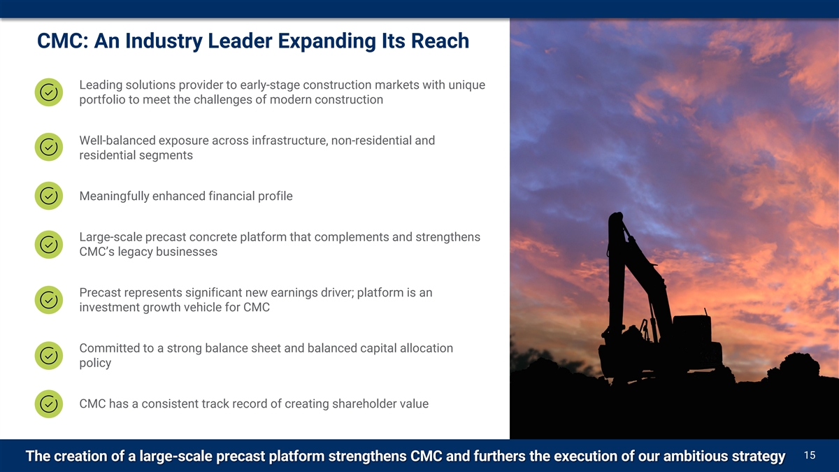 CMC:行业领导者,通过独特的投资组合将其覆盖范围扩大到早期建筑市场的领先解决方案提供商,以应对现代建筑的挑战-跨基础设施的均衡敞口,非住宅和住宅领域显着增强了财务状况大型预制混凝土平台,补充和加强了CMC的传统业务Precast代表了重要的新盈利驱动因素;平台是CMC的投资增长工具致力于强大的资产负债表和平衡的资本分配政策CMC在创造股东价值方面有着一贯的记录1615创建大型预制平台加强了CMC并进一步执行我们雄心勃勃的战略