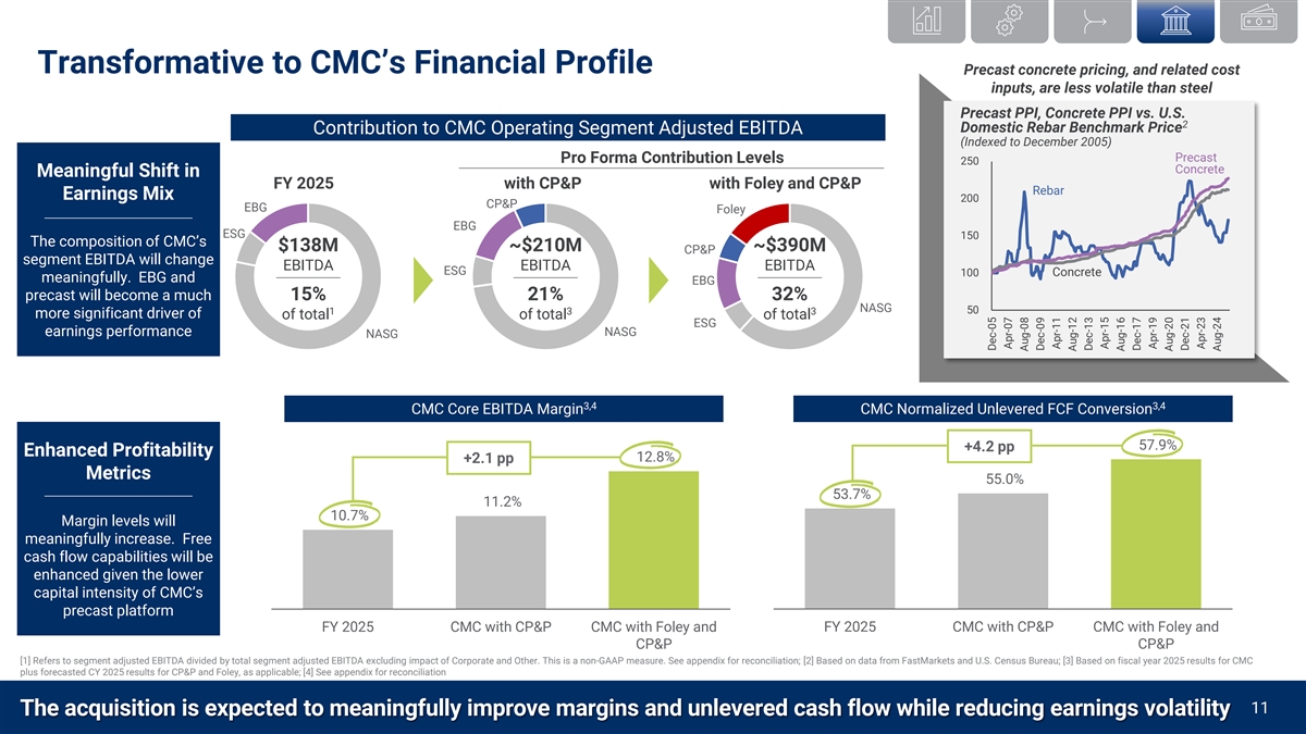 对CMC财务状况的变革预制混凝土定价和相关成本投入的波动性低于钢铁预制PPI、混凝土PPI与美国2国内螺纹钢基准价格对CMC经营部门调整后EBITDA的贡献(指数化至2005年12月)Precast Pro Forma贡献水平250 Concrete有意义的转变2025财年与CP & P的福利和CP & P螺纹钢收益混合200 CP & P EBG Foley EBG ESG 150 CMC的1.38亿美元~2.1亿美元~3.9亿美元CP & P部门EBITDA的构成将有意义地改变EBITDA EBITDA ESG 100 Concrete。EBG和EBG预制将成为远15% 21% 32% NASG 50133更重要的驱动因素合计ESG总收益表现NASG NASG 3,43,4CMC核心EBITDA利润率CMC标准化无杠杆FCF转换57.9% + 4.2个百分点增强的盈利能力12.8% + 2.1个百分点指标55.0% 53.7% 11.2% 10.7%利润率水平将有意义地提高。鉴于CMC的预制平台2025财年CMC与CP & P CMC与Foley和2025财年CMC与CP & P CMC与Foley和CP & P CP & P的资本密集度较低,自由现金流能力将得到增强[ 1 ]指分部调整后EBITDA除以分部调整后EBITDA总额,不包括公司和其他的影响。这是一项非公认会计原则的衡量标准。调节见附录;[ 2 ]基于FastMarkets和美国人口普查局的数据;[ 3 ]基于CMC的2025财年业绩加上CP & P和Foley的2025年预测业绩(如适用);[ 4 ]调节见附录12 CMC收购X11此次收购预计将显着提高利润率和无杠杆现金流,同时降低盈利波动Dec-05 Apr-07 Aug-08 Dec-09 Apr-11 Aug-12 Dec-13 Apr-15 Aug-16 Dec-17 Apr-19 Aug-20 Dec-21 Apr-23 Aug-24