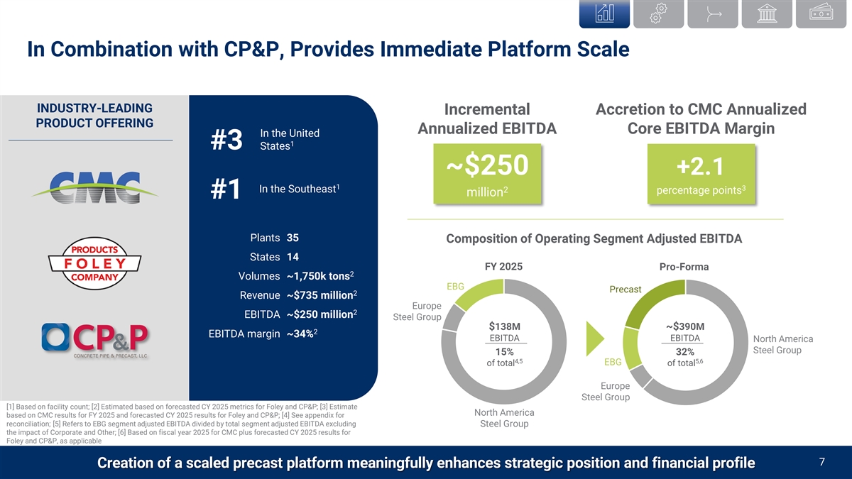 结合CP & P,为CMC提供即时平台规模行业领先的增量年化产品提供年化EBITDA核心EBITDA利润率在美国1 # 3个州~250美元+ 2.11 3个东南地区2个百分点百万# 1工厂35运营部门构成调整后EBITDA状态14 FY 2025备考2卷~175万吨EBG Precast 2收入~7.35亿美元欧洲2 EBITDA~2.5亿美元钢铁集团1.38亿美元~3.9亿美元2 EBITDA利润率~34% EBITDA EBITDA北美钢铁集团15% 32% 4,55,6 EBG总额欧洲钢铁集团[ 1 ]基于设施数量;[ 2 ]基于预测CY估计Foley和CP & P的2025年指标;[ 3 ]根据CMC的2025财年业绩和Foley和CP & P的2025年预测业绩估计北美;[ 4 ]对账见附录;[ 5 ]指EBG分部调整后EBITDA除以不包括Steel Group的总分部调整后EBITDA企业和其他的影响;[ 6 ]基于CMC的2025财年加上Foley和CP & P的2025年预测业绩,如适用,CMC收购X7创建规模化的预制平台,有意义地增强了战略地位和财务状况