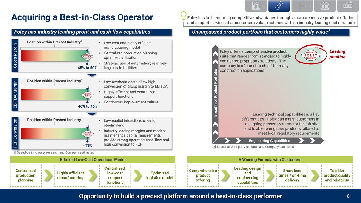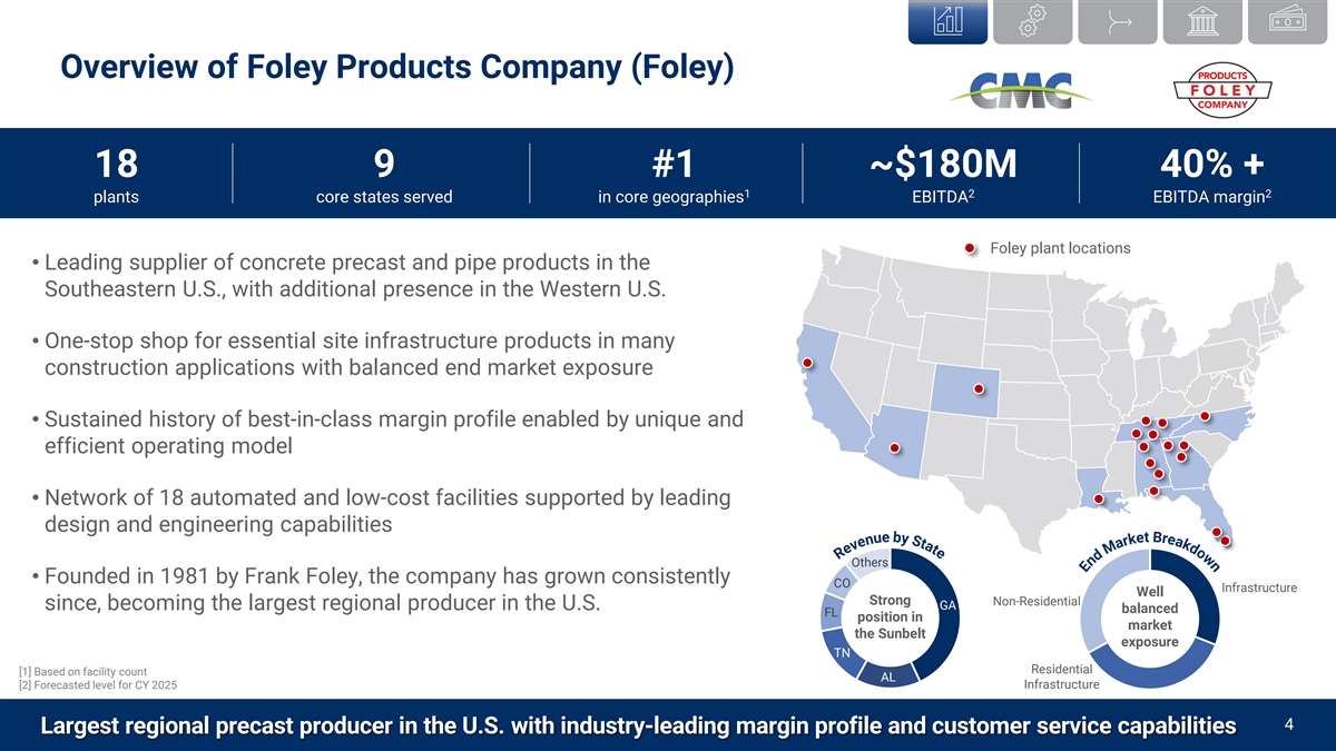 Foley Products Company(Foley)概述189 # 1~1.8亿美元40% + 122家工厂核心地区服务的核心州EBITDA EBITDA利润率Foley工厂所在地•美国东南部混凝土预制和管材产品的领先供应商,随着在美国西部的更多业务•在许多建筑应用中为必要的场地基础设施产品提供一站式服务,终端市场敞口均衡•通过独特而高效的运营模式实现一流利润率的持续历史•由领先的设计和工程能力支持的18个自动化和低成本设施组成的网络其他•该公司由Frank Foley于1981年创立,自那以来,CO Infrastructure Well Strong Non-Residential GA持续增长,成为美国最大的区域生产商平衡FL在市场上的地位Sunbelt曝光TN Residential [ 1 ]基于设施数量AL Infrastructure [ 2 ] 2025年预测水平美国4家最大的区域预制生产商,拥有行业领先的利润率概况和客户服务能力