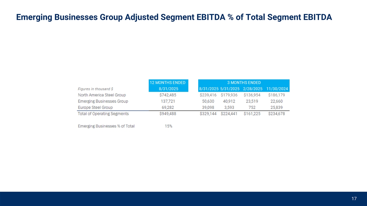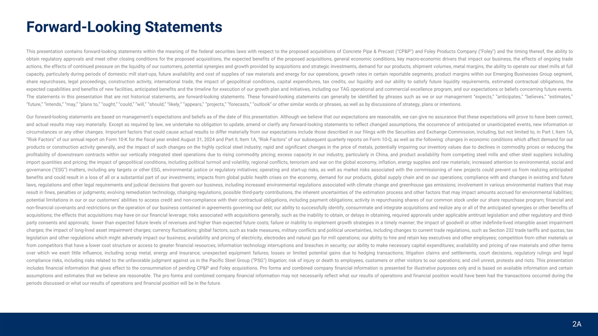 前瞻性陈述本演示文稿包含联邦证券法意义上的前瞻性陈述,涉及对Concrete Pipe & Precast(CP & P)和Foley Products Company(Foley)的拟议收购及其时机、获得监管批准和满足拟议收购的其他完成条件的能力、拟议收购的预期收益、总体经济状况、影响我们业务的关键宏观经济驱动因素、正在进行的贸易行动的影响、对我们客户流动性的持续压力的影响、收购和战略投资提供的潜在协同效应和增长,对我们产品的需求、发货量、金属利润率、我们的钢厂开足马力运营的能力,特别是在国内钢厂开工期间、我们运营的原材料和能源供应的未来可用性和成本、某些可报告分部的增长率、我们新兴业务集团分部的产品利润率、股票回购、法律诉讼、建筑活动、国际贸易、地缘政治条件的影响、资本支出、税收抵免、我们的流动性和我们满足未来流动性要求的能力、估计的合同义务、新设施的预期能力和收益,预期收益和执行我们的增长计划和举措的时间表,包括我们的TAG运营和商业卓越计划,以及我们对未来事件的期望或信念。本演示文稿中不属于历史陈述的陈述,为前瞻性陈述。这些前瞻性陈述通常可以通过我们或我们的管理层“预期”、“预期”、“相信”、“估计”、“未来”、“打算”、“可能”、“计划”、“应该”、“可能”、“将”、“应该”、“可能”、“出现”、“项目”、“预测”、“展望”或其他类似词语或短语,以及通过对战略、计划或意图的讨论来识别。我们的前瞻性陈述是基于管理层截至本演示文稿发布之日的预期和信念。尽管我们认为我们的预期是合理的,但我们不能保证这些预期将被证明是正确的,实际结果可能会有重大差异。除法律要求外,我们不承担更新、修正或澄清任何前瞻性陈述以反映已改变的假设、预期或未预期事件的发生、新信息或情况或任何其他变化的义务。可能导致实际结果与我们预期存在重大差异的重要因素包括我们向美国证券交易委员会提交的文件中所述的因素,包括但不限于我们截至2024年8月31日的财政年度的10-K表格年度报告第一部分第1A项中的“风险因素”和我们随后的10-Q表格季度报告第二部分第1A项中的风险因素,以及以下因素:影响对我们产品或建筑活动的总体需求的经济状况变化,以及此类变化对高度周期性钢铁行业的影响;金属价格的快速和显着变化,可能会因商品价格下跌而削弱我们的库存价值,或因商品价格上涨而降低我们垂直一体化钢铁业务中下游合同的盈利能力;我们行业的产能过剩,特别是在中国,以及来自竞争钢厂和其他钢铁供应商的产品供应,包括进口数量和定价;地缘政治条件的影响,包括政治动荡和波动、区域冲突、恐怖主义和战争对全球经济、通货膨胀,能源供应和原材料;更多地关注环境、社会和治理(“ESG”)事项,包括任何目标或其他ESG、环境正义或监管举措;运营和启动风险,以及与新项目投产相关的市场风险可能会阻止我们实现预期收益,并可能导致我们的全部或大部分投资损失;全球公共卫生危机对经济、对我们产品的需求、全球供应链和我们的运营的影响;现有和未来法律的遵守和变化,监管我们业务的法规和其他法律要求及司法裁决,包括增加与气候变化和温室气体排放相关的环境法规;参与可能导致罚款、处罚或判决的各种环境事项;不断发展的补救技术、不断变化的法规、可能的第三方贡献, 估计过程的内在不确定性以及可能影响环境负债应计金额的其他因素;我们或我们的客户获得信贷的能力可能受到限制,以及不遵守其合同义务,包括付款义务;根据我们的股票回购计划回购我们普通股的活动;管理我们债务的协议中包含的财务和非财务契约以及对我们业务运营的限制;我们成功识别的能力,完善和整合收购,并实现收购的任何或所有预期协同效应或其他利益;收购可能对我们的财务杠杆产生的影响;与收购相关的一般风险,例如无法获得或延迟获得,根据适用的反垄断立法和其他监管和第三方的同意和批准需要获得批准;未来收入水平低于预期,未来成本高于预期;未能或无法及时实施增长战略;商誉或其他无限期无形资产减值费用的影响;长期资产减值费用的影响;货币波动;全球因素,例如贸易措施、军事冲突和政治不确定性,包括对现行贸易法规的修改,例如第232条贸易关税和配额,可能对我们的业务产生不利影响的税收立法和其他法规;用于工厂运营的电力、电极和天然气的可用性和定价;我们雇用和留住关键高管和其他员工的能力;来自其他材料或来自成本结构较低或获得更多财务资源的竞争对手的竞争;信息技术中断和安全漏洞;我们进行必要资本支出的能力;原材料和我们几乎没有影响的其他项目的可用性和定价,包括废金属,能源和保险;意外设备故障;对冲交易造成的损失或有限的潜在收益;诉讼索赔和和解、法院判决、监管裁决和法律合规风险,包括与太平洋钢铁集团(“PSG”)诉讼中对我们不利的判决相关的风险;员工、客户或我们运营的其他访客受伤或死亡的风险;以及内乱、抗议和骚乱。该演示文稿包括财务信息,这些信息使完成未决的CP & P和Foley收购生效。备考和合并后的公司财务信息仅用于说明目的,并基于现有信息和我们认为合理的某些假设和估计。备考和合并后的公司财务信息可能不一定反映如果交易发生在所讨论的期间,我们的经