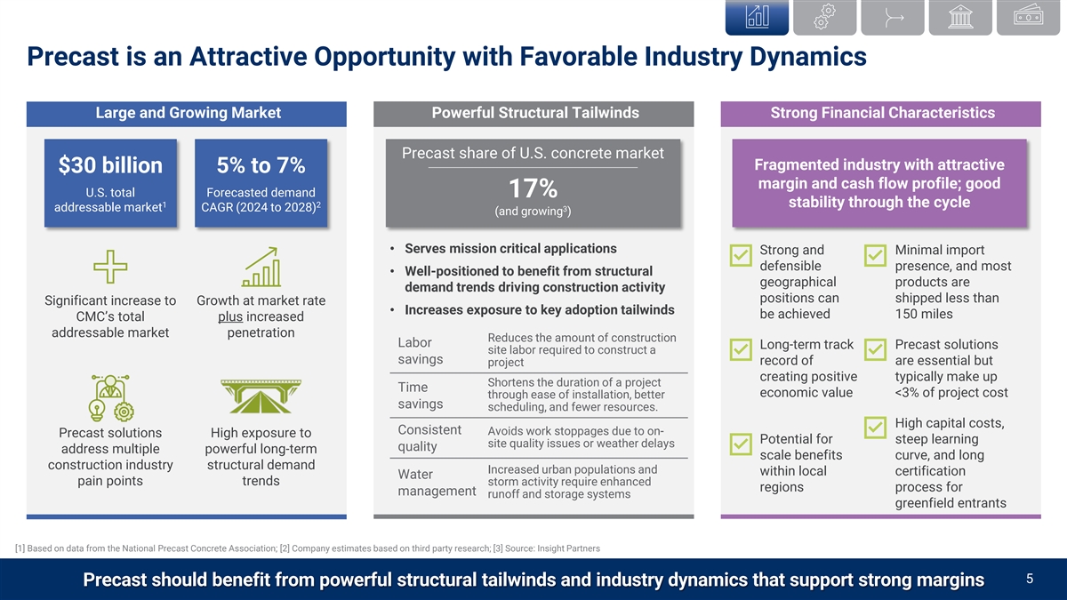 Precast是一个有吸引力的机会,具有有利的行业动态大且不断增长的市场强大的结构性顺风强劲的财务特征Precast在美国混凝土市场的份额分散的行业具有300亿美元的吸引力5%至7%的利润率和现金流状况;良好的美国总预测需求17% 12稳定通过周期可寻址市场CAGR(2024至2028年)3(并且不断增长)•服务于关键任务应用强大且最小的进口可防御存在,和大多数•处于有利地位,可从结构性地理产品中受益的是需求趋势,推动建筑活动职位的出货量低于按市场速度增长的显着增长•增加对关键采用顺风的敞口可实现150英里CMC的总规模加上可寻址市场渗透率的增加减少了建筑劳力的数量长期轨道预制解决方案现场所需的劳力建造节省记录是必不可少的,但项目创造积极通常通过易于安装、更好的节省调度和更少的资源来弥补缩短项目的持续时间经济价值<项目成本的3%。高资本成本,始终如一地避免因预制解决方案而导致的停工高暴露可能导致陡峭的学习场地质量问题或天气延误质量解决多个强大的长期规模效益曲线,和长期建筑行业结构性需求增加城市人口和当地认证范围内水痛点趋势风暴活动需要加强区域流程对管理径流和存储系统绿地入局者[ 1 ]基于美国预制混凝土协会的数据;[ 2 ]公司估计基于第三方研究;[ 3 ]资料来源:Insight Partners CMC收购X5预制应受益于强大的结构性顺风和支持强劲利润率的行业动态