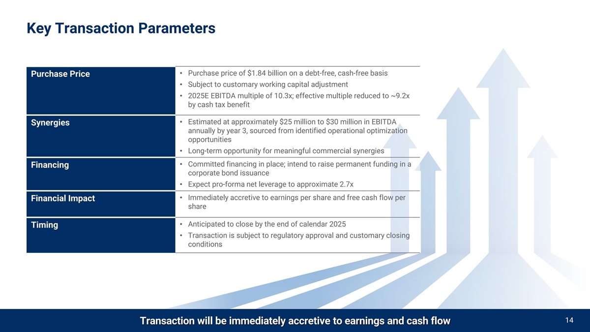 关键交易参数•在无债务、无现金基础上的购买价格为18.4亿美元•须按惯例进行营运资本调整• 2025年EBITDA倍数为10.3倍;由于现金税收优惠,有效倍数降至~9.2倍•估计到第3年EBITDA协同效应每年约为2500万美元至3000万美元,来源自已确定的运营优化机会•实现有意义的商业协同效应的长期机会•承诺融资到位;打算通过发行融资公司债券筹集永久资金•预计备考净杠杆约为2.7倍•立即增加每股收益和每股财务影响份额的自由现金流•预计将于2025年年底完成交易时间•交易需获得监管部门的批准和惯例成交条件14交易将立即增加收益和现金流