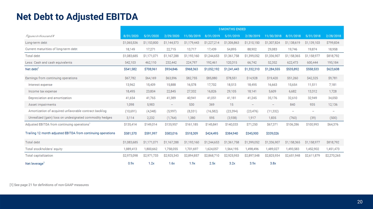 调整后EBITDA的净债务[ 1 ]有关非公认会计原则措施的定义,请参见第21页2020