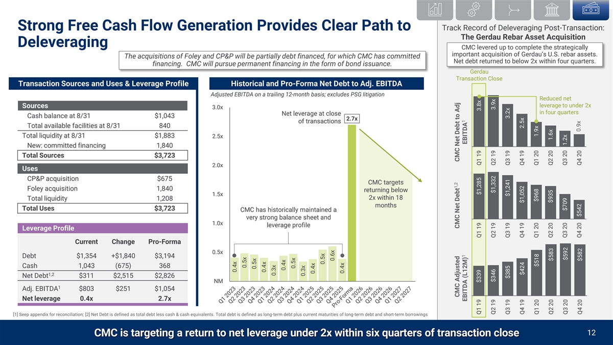 强劲的自由现金流产生为交易后去杠杆化的往绩记录提供了清晰的路径:Gerdau螺纹钢资产收购去杠杆化CMC完成了对Gerdau美国螺纹钢资产的具有战略意义的收购。对Foley和CP & P的收购将部分通过债务融资,为此CMC已承诺在四个季度内将净债务恢复到2倍以下。融资。CMC将以发行债券的形式寻求永久性融资。盖尔道交易关闭交易来源和用途&杠杆概况历史以及对Adj. EBITDA的备考净债务调整后EBITDA在过去12个月的基础上;不包括PSG诉讼将净杠杆降低至低于2倍来源3.0x四个季度的净杠杆接近现金余额8/31的净杠杆1,043美元2.7x交易的可用融资总额8/31840总流动性8/31的1,883美元2.5x新:承诺融资1,840总来源3,723美元2.0x使用CP & P收购675美元CMC目标Foley收购1,840在18年内回报低于1.5x 2倍总流动性1,208个月总使用3,723美元CMC历来保持着非常强劲的资产负债表和1.0x杠杆概况杠杆概况当前变化预估0.5x债务$ 1,354 + $ 1,840 $ 3,194现金1,043(675)3681,2净债务$ 311 $ 2,515 $ 2,826 NM 1 Adj. EBITDA $ 803 $ 251 $ 1,054净杠杆0.4x 2.7x [ 1 ] Seep附录以供调节;[ 2 ]净债务定义为总债务减去现金和现金等价物。总债务定义为长期债务加上当前到期的长期债务和短期借款13 CMC收购X12 CMC的目标是在交易结束后的六个季度内恢复到2倍以下的净杠杆率0.4x 0.5x 0.5x 0.4x 0.3x 0.4x 0.5x 0.3x 0.3x 0.5x 0.3x 0.5x 0.6x 0.4x 1,2 CMC调整后CMC净债务CMC净债务与调整后11 EBITDA(L12M)EBITDA Q1 19 $ 339 Q1 19 $ 1,285 Q1 19 3.8x Q2 19 $ 346 Q2 19 $ 1,332 Q2 19 3.9x Q3 19 $ 385 Q3 19 $ 1,241 Q3 19 3.2x Q4 19 $ 424 Q4 19 $ 1,052 Q4 19 2.5x Q1 20 $ 968 Q1 20 1.9x Q1 20 $ 518 Q2 20 $ 583Q2 20 $ 935 Q2 20 1.6x Q3 20 $ 709 Q3 20 1.2x Q3 20 $ 592 0.9x Q4 20 $ 542 Q4 20 Q4 20 $ 582