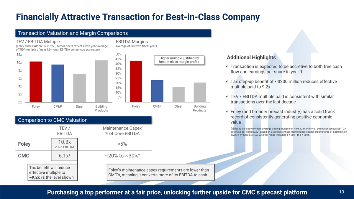 对一流公司交易估值和利润率比较具有财务吸引力的交易TEV/EBITDA倍数EBITDA利润率(Foley和CP & P on CY 2025E,行业同行反映两年平均过去两个财年TEV倍数的未来12个月EBITDA共识估计)12x 50%更高的倍数被额外亮点证明是合理的45%一流的利润率状况10x 40% ü交易预计将增加两个自由现金35% 8x流量第一年每股收益30% 25% 6x ü税收递增收益约2亿美元将有效20% 4x支付倍数降至9.2x 15% 10% 2x ü TEV/EBITDA支付倍数与过去十年类似的5% – 0x交易一致Foley CP & P Steel Building Foley CP & P Steel Building Products ü Foley(以及更广泛的预制行业)在持续产生与CMC估值价值TEV/维护资本支出[ 1 ]的积极经济比较方面有着良好的业绩记录基于过去两年对未来12个月华尔街一致EBITDA估计的平均交易倍数Refinitiv;[ 2 ]基于假设年度维护资本支出2.5亿美元EBITDA占核心EBITDA的百分比除以核心EBITDA,范围包括2021财年至2025财年10.3x Foley < 5% 2025年EBITDA 12 CMC 6.1x~20%至~30%税收优惠将降低Foley的维护资本支出要求低于CMC的有效倍数,这意味着它将更多的EBITDA转化为现金~9.2x,而13以合理价格购买表现最好的公司的水平,为CMC的预制平台释放进一步的上行空间