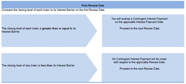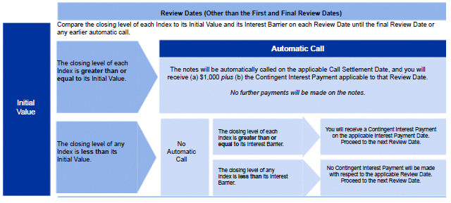由于每个指数在第二个审核日的收盘水平大于或等于其初始值,票据将自动被要求支付现金,每张本金为1,000美元的票据为1,0 18.125美元(或1,000美元加上适用于第二个审核日的或有利息支付),在适用的赎回结算日支付。票据不会在第二个审核日之前自动赎回,即使每个指数在第一个审核日的收盘水平高于其初始值。如果加上就先前审查日期收到的或有利息付款,每张1000美元本金票据支付的总金额为1036.25美元。票据将不再支付任何款项。