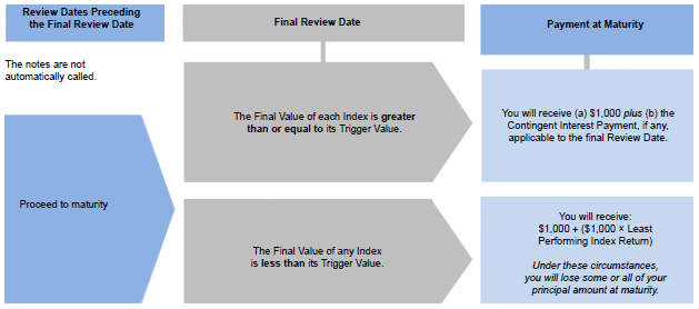 自动调用: 如果每个指数在任何审核日(第一个和最后一个审核日除外)的收盘水平高于或等于其初始值,则票据将自动被要求支付现金,每张本金为1,000美元的票据,等于(a)1,000美元加上(b)适用于该审核日的或有利息付款,应在适用的赎回结算日支付。票据将不再支付任何款项。 到期付款: 如果票据未被自动赎回,且每个指数的最终价值大于或等于其触发值,您将在到期时收到现金付款,每张本金金额为1,000美元的票据,等于(a)1,000美元加上(b)适用于最终审查日期的或有利息付款(如有)。 如果票据未被自动赎回,且任何指数的最终价值低于其触发值,则每张1,000美元本金票据的到期付款将按以下方式计算: $ 1,000 +($ 1,000 ×表现最差指数回报) 如果票据未被自动赎回,且任何指数的终值低于其触发值,您将在到期时损失超过本金金额的30.00%,并可能在到期时损失全部本金金额。 表现最差指数:指数回报率表现最差的指数 表现最差的指数收益:各指数的指数收益最低 指数回报:就各指数而言, (终值–初值) 初始值:就各指数而言,该指数在定价日的收盘水平 终值:就各指数而言,该指数于最后审查日的收市水平