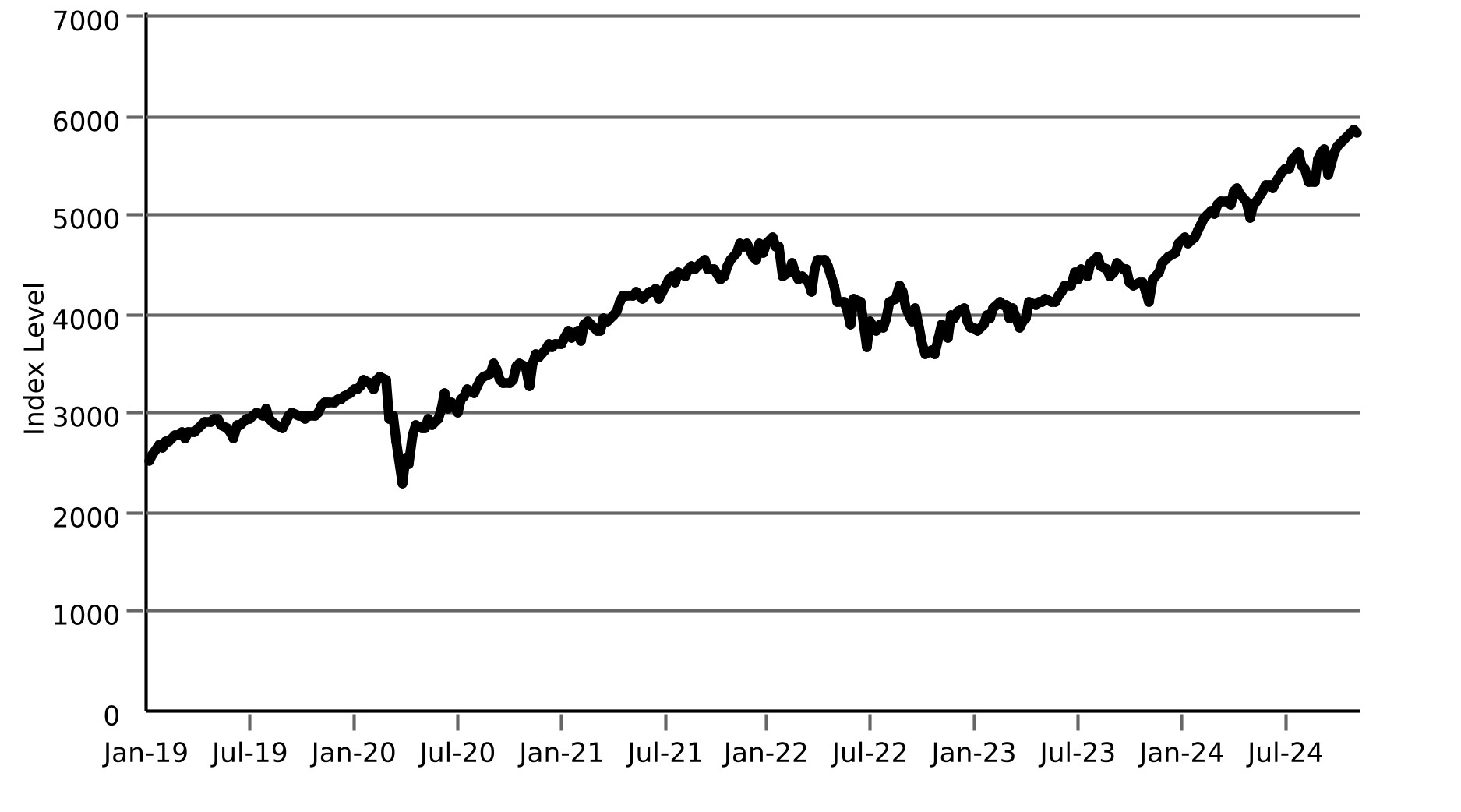 以下图表根据2019年1月4日至2024年10月25日的每周历史收盘水平,列出了各指数的历史表现。纳斯达克-100指数® 2024年10月31日收盘水平为19,890.42。罗素2000 ®指数2024年10月31日收盘水平为2,196.652。标普 500 ®指数2024年10月31日收盘水平为5705.45点。我们从Bloomberg Professional ® service(“Bloomberg”)获得了收盘水平的上、下两个点,未经独立核实。