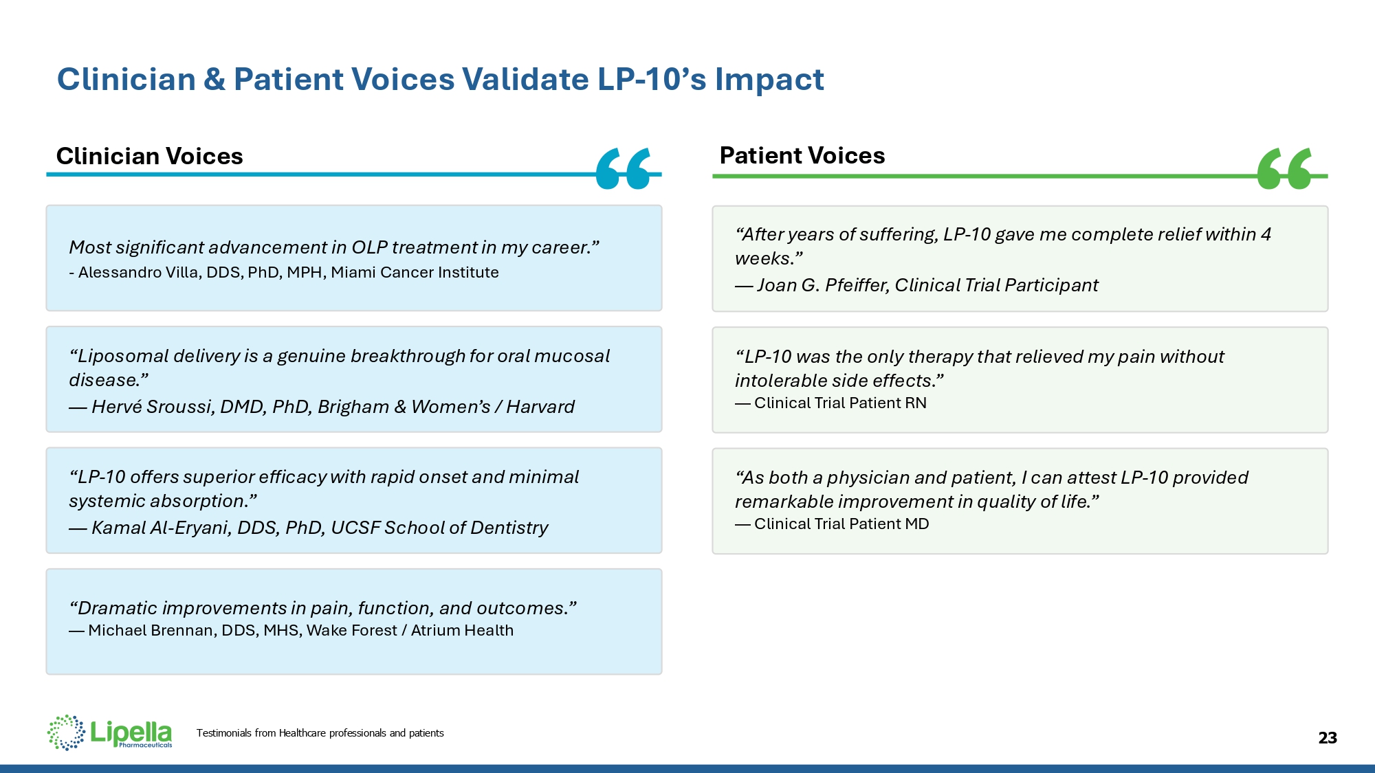 23条临床医生和患者的声音验证了LP-10来自医疗保健专业人员和患者的影响感言临床医生的声音表明,在我的职业生涯中,OLP治疗取得了最重要的进步。”-Alessandro Villa,DDS,PhD,MPH,迈阿密癌症研究所“脂质体递送是口腔黏膜疾病的真正突破。”— Herv é Sroussi,DMD,PhD,Brigham & Women's/Harvard“LP-10提供卓越的疗效,起效迅速,全身吸收最少。”— Kamal Al-Eryani,DDS,博士,加州大学旧金山分校牙科学院“疼痛、功能和结果显着改善。”— Michael Brennan,DDS,MHS,Wake Forest/Atrium Health“在经历了多年的痛苦之后,LP-10在4周内让我完全松了一口气。”— Joan G. Pfeiffer,临床试验参与者“LP-10是唯一能缓解我疼痛且没有无法忍受的副作用的疗法。”—临床试验患者RN“作为医生和患者,我可以证明LP-10提供了显着的生活质量改善。”—临床试验患者MD患者发声““