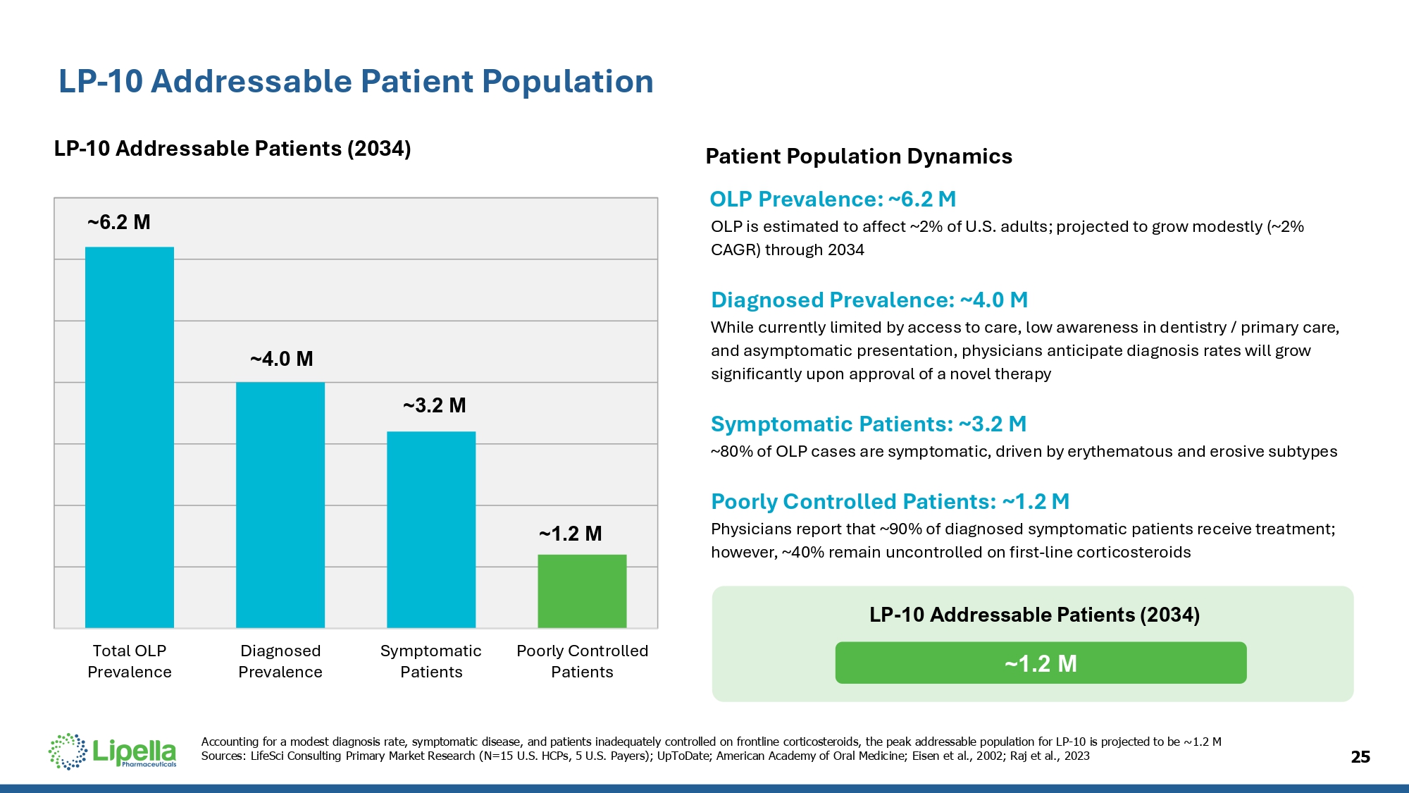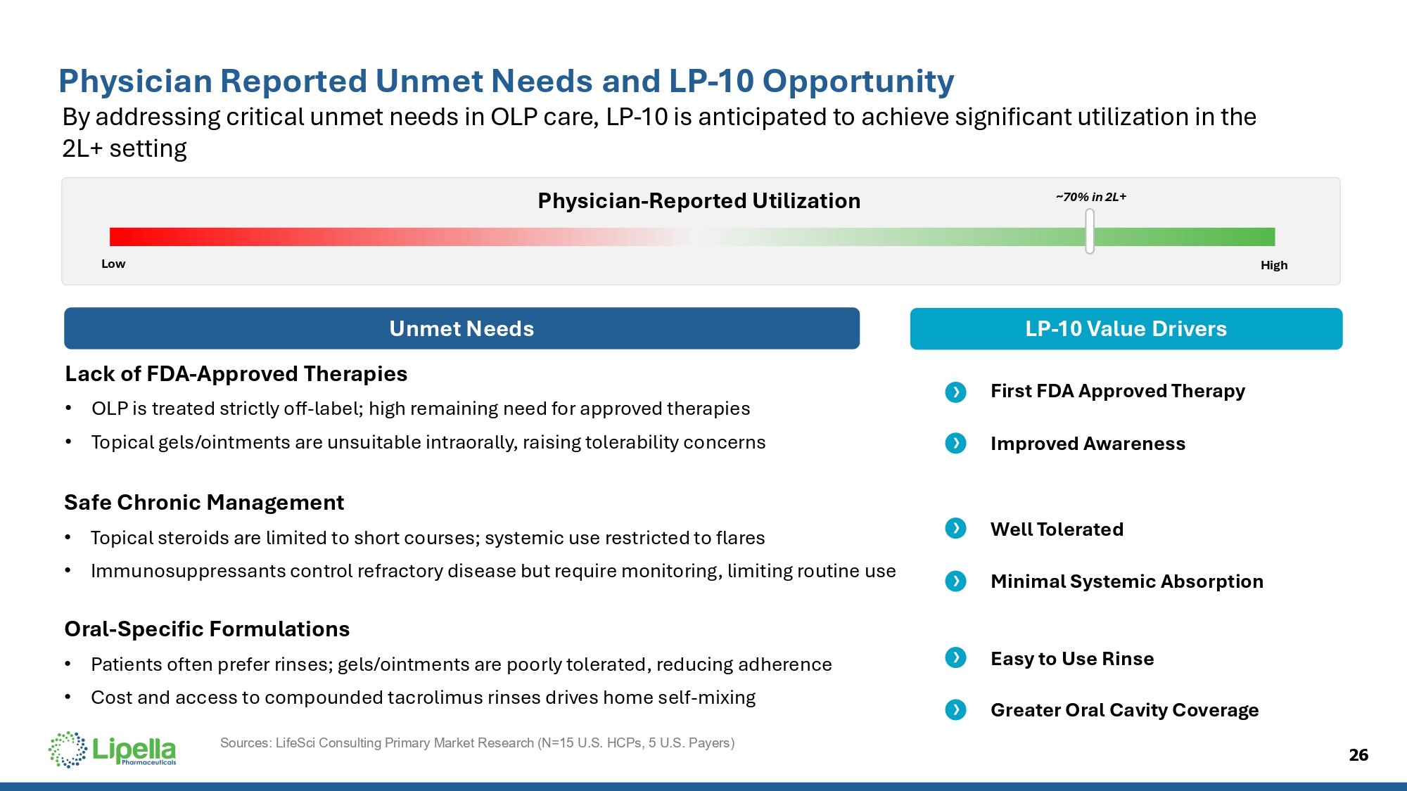 26位医生报告了未满足的需求和LP-10机会首次获得FDA批准的疗法提高了意识安全的慢性管理•外用类固醇仅限于短期疗程;全身使用仅限于耀斑•免疫抑制剂可控制难治性疾病,但需要监测,限制了缺乏FDA批准的疗法的常规使用• OLP的治疗严格脱标;对批准的疗法的高剩余需求•外用凝胶/软膏不适合口服,引起耐受性问题口服特定剂型•患者通常更喜欢冲洗;凝胶/软膏的耐受性较差,减少依从性•复合他克莫司冲洗的成本和可及性推动家庭自混合耐受性良好的最小全身吸收易于使用冲洗更大的口腔覆盖率来源:LifeSci Consulting一级市场研究(N = 15个美国HCP,5个美国付款人)未满足的需求LP-10价值驱动医师-报告的利用率高低~70%在2L +通过解决在OLP护理中未满足的关键需求,LP-10预计将在2L +环境中实现显着利用率