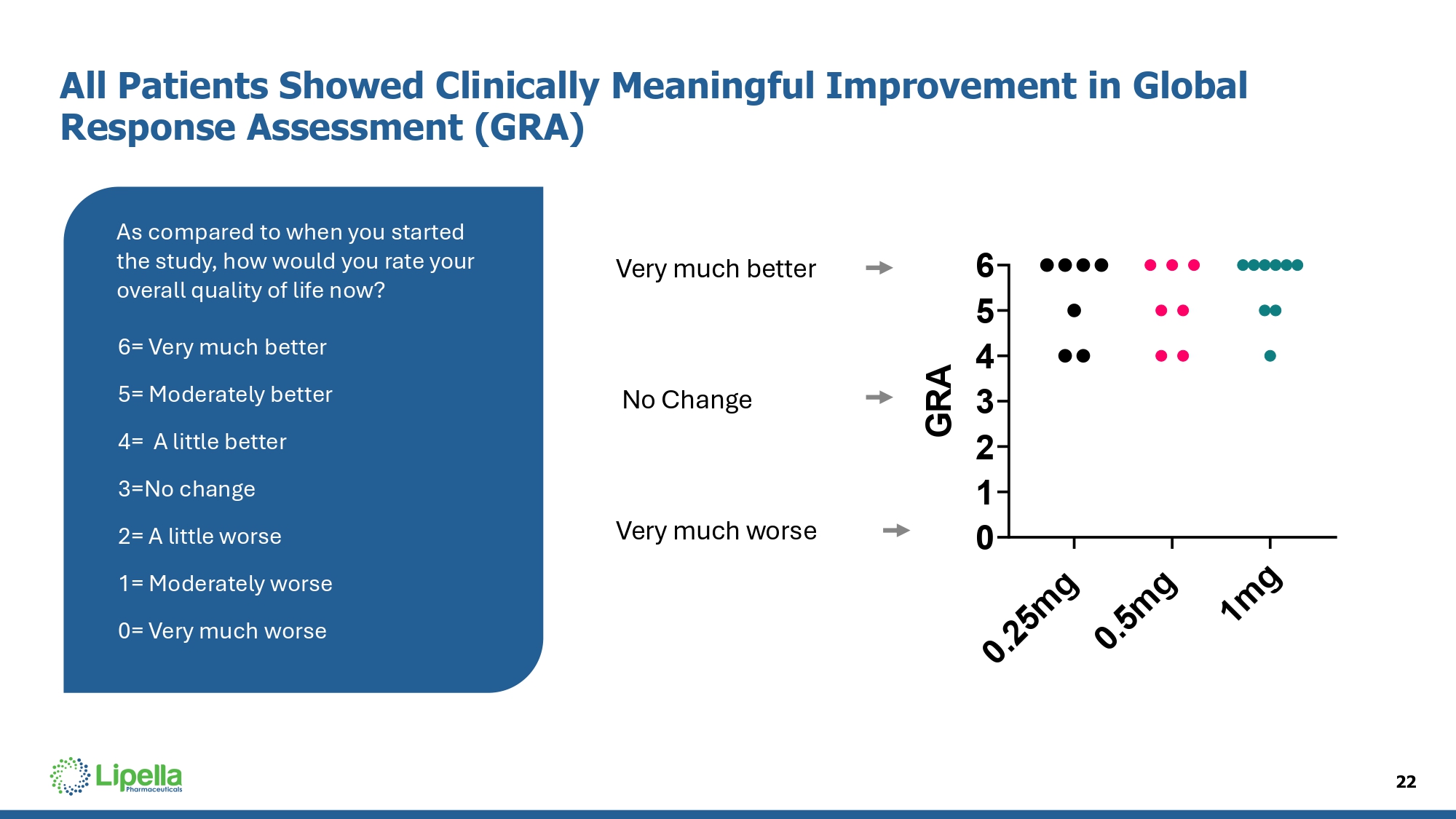 22 very much better no change very much worse compared with when you started the study,how will you rate your overall quality of life now?6 =非常好5 =适度好4 =稍微好一点3 =没有变化2 =稍微差一点1 =适度差0 =非常差0。25 m g 0。5 m g 1 m g 0123456 g R A所有患者均显示Clinicall y全球反应评估(GRA)有意义的改善