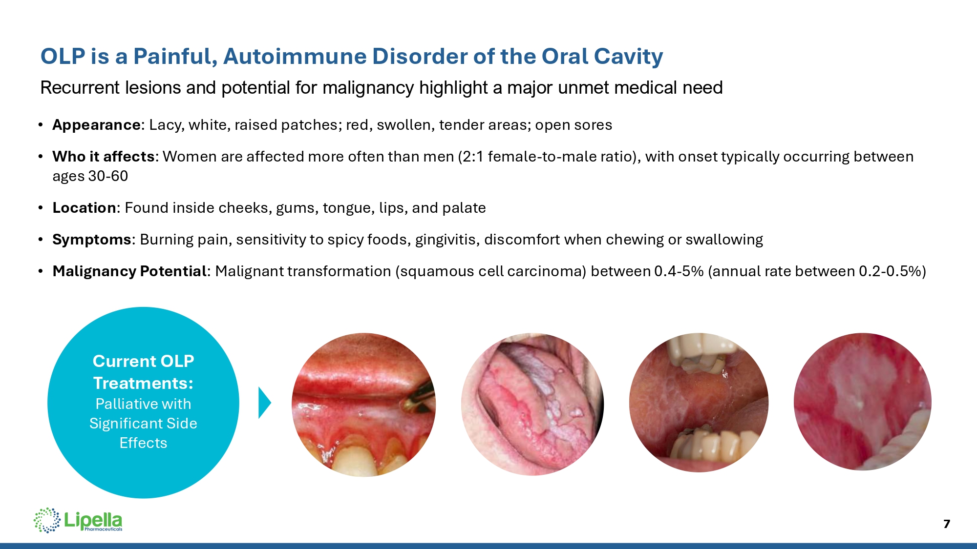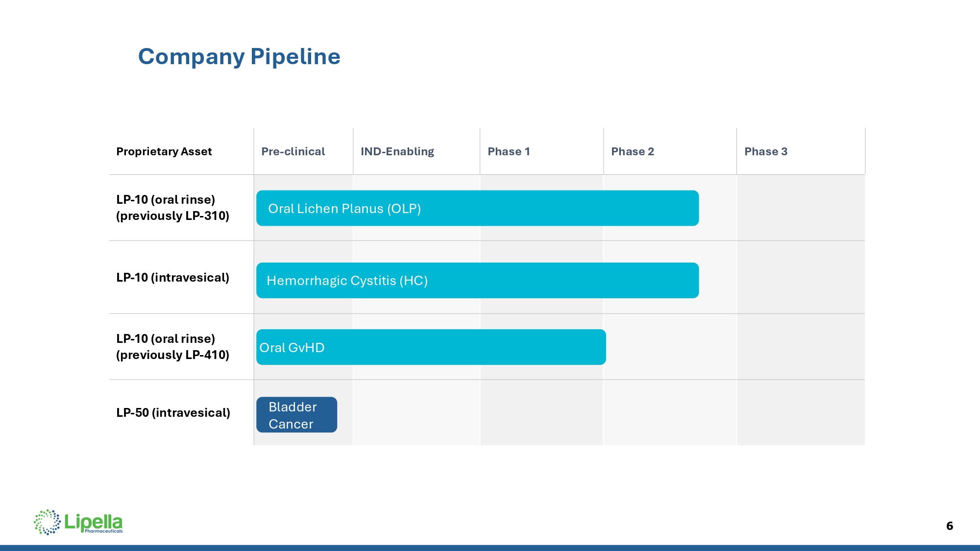 6公司管线专有资产预临床IND-启用1期2期3期LP-10(口服冲洗)(原LP-310)LP-10(膀胱内)LP-10(口服冲洗)(原LP-410)LP-50(膀胱内)口腔扁平苔藓(OLP)出血性膀胱炎(HC)膀胱癌口服GVHD