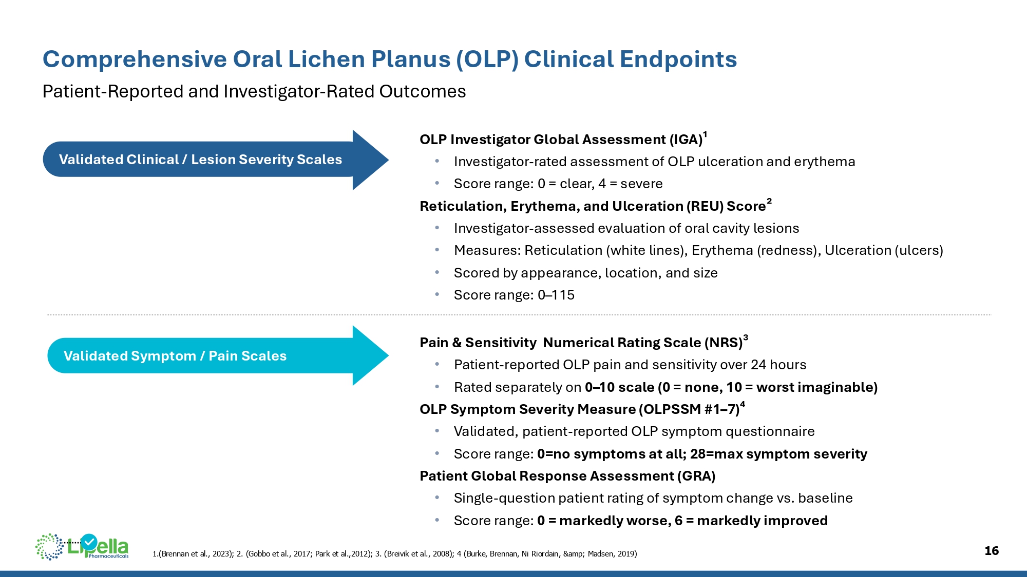 16份经过验证的临床/病变严重程度量表经过验证的症状/疼痛量表综合口腔扁平苔藓(OLP)临床终点丨OLP丨研究者全球评估(IGA)丨•研究者-评定OLP溃疡和红斑•评分范围:0 =明确,4 =严重网状、红斑、溃疡(REU)评分² •研究者-评估口腔病变•测量:网状(白线)、红斑(发红)、溃疡(溃疡)•按外观、位置和大小评分•评分范围:0– 115.1(Brennan等,2023);2。(Gobbo et al.,2017;Park et al.,2012);3。(Breivik et al.,2008);4(Burke,Brennan,Ni Riordain,& Madsen,2019)疼痛与敏感度数值评级表(NRS)丨•患者-在24小时内报告了OLP疼痛和敏感度•在0– 10级(0 =无,10 =可以想象的最差)上分别评级(OLP OLP症状严重程度测量(OLPSSM # 1 – 7)丨•经过验证、患者-报告了OLP症状问卷•评分范围:0 =完全没有症状;28 =最大症状严重程度患者整体反应评估(GRA)•单问题患者对症状变化与基线的评分•评分范围:0 =明显恶化,6 =明显改善的患者-报告和研究者-评级结果