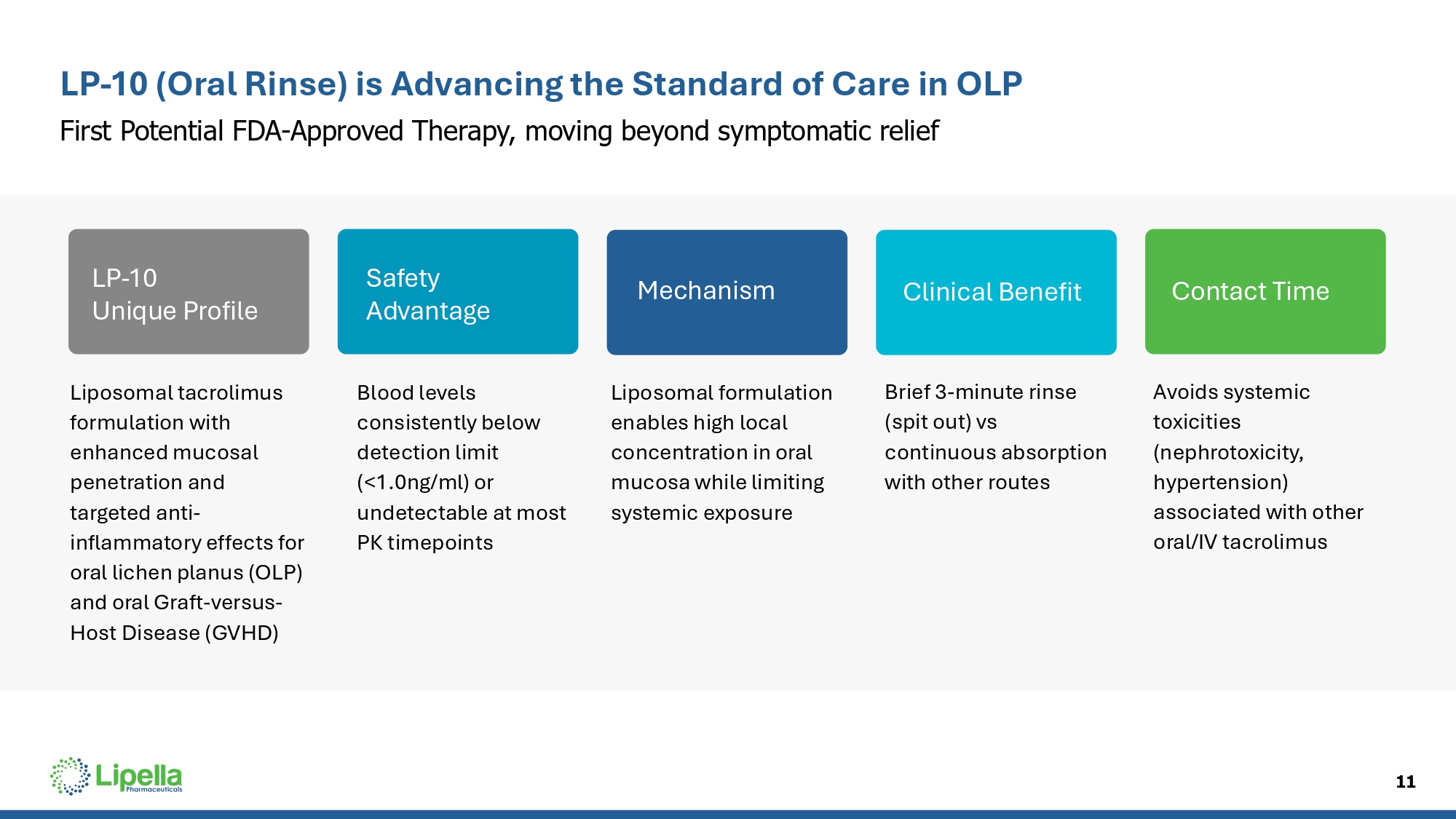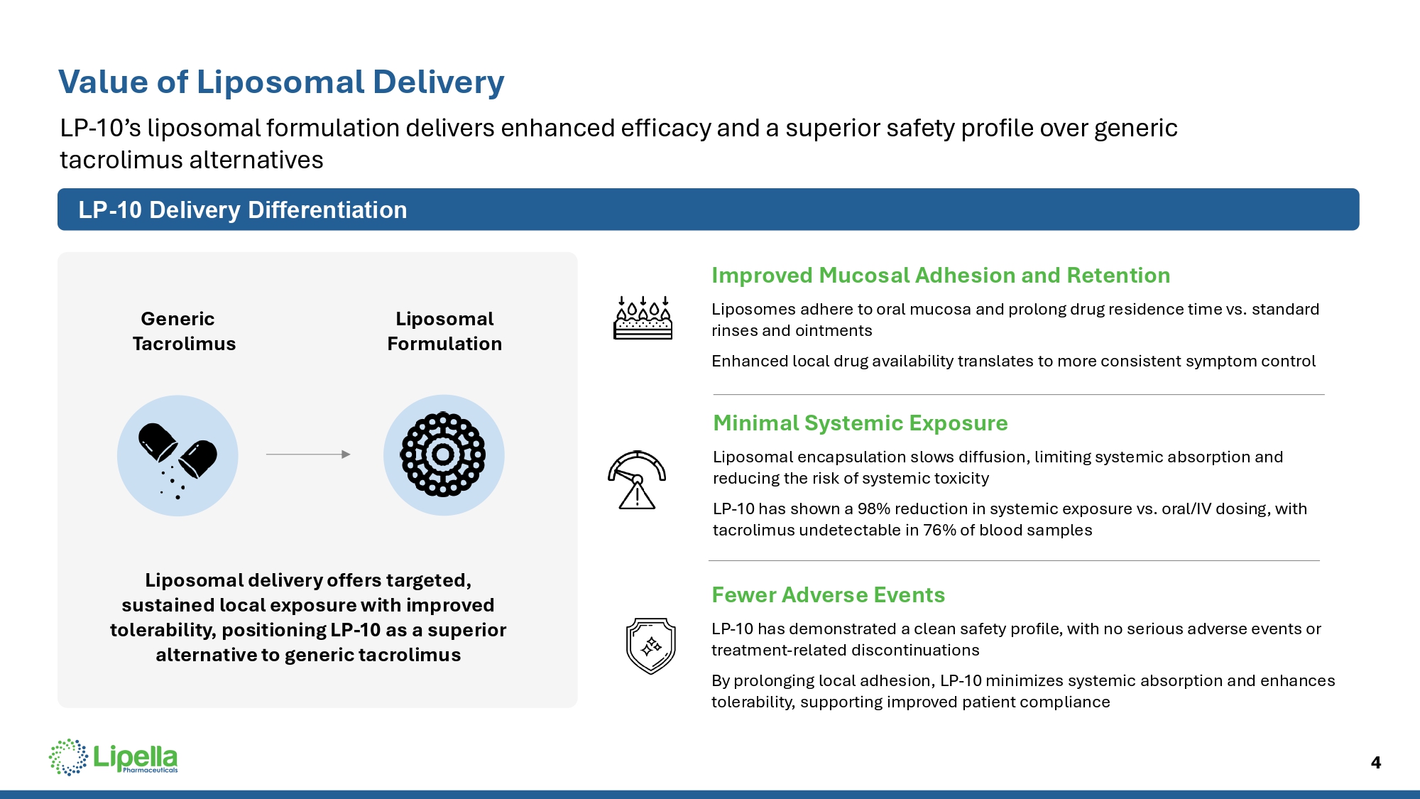 4脂质体递送的价值改善了黏膜粘附和保留脂质体与口腔黏膜的粘附和延长药物停留时间,与标准冲洗和软膏相比,增强的局部药物可利用性转化为更一致的症状控制最小的全身暴露脂质体封装减缓扩散,限制全身吸收并降低全身毒性风险LP-10显示,与口服/IV给药相比,全身暴露减少了98%,在76%的血液样本中检测不到他克莫司更少的不良事件LP-10已证明了一种干净的安全性,由于没有严重的不良事件或与治疗相关的停药,LP-10通过延长局部粘附最大限度地减少全身吸收并提高耐受性,支持改善患者依从性的脂质体递送提供有针对性的、持续的局部暴露并提高耐受性,将LP-10定位为通用他克莫司脂质体制剂的优越替代品通用他克莫司LP-10的脂质体制剂提供了比通用他克莫司替代品LP-10递送差异化更强的疗效和更优的安全性